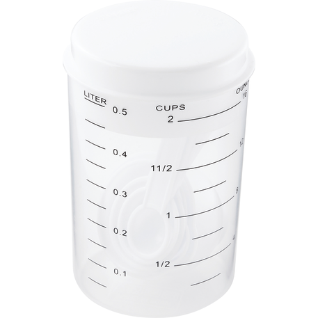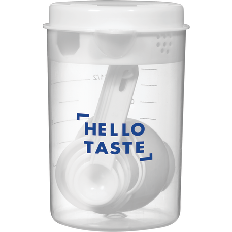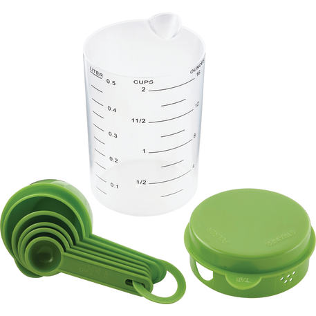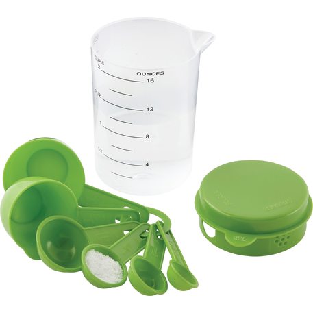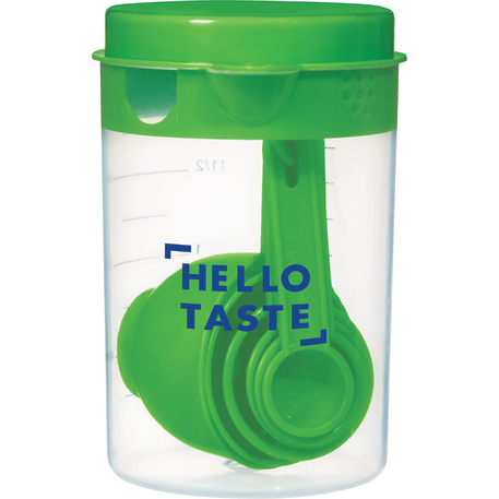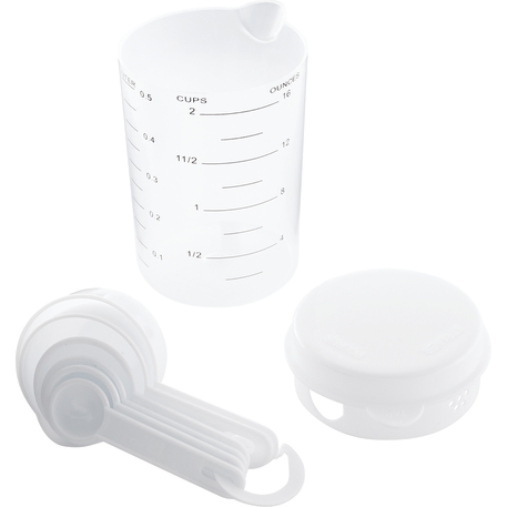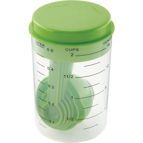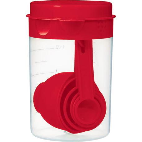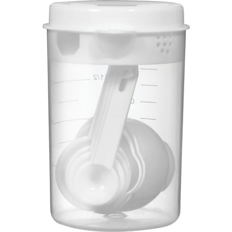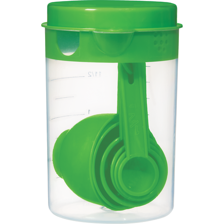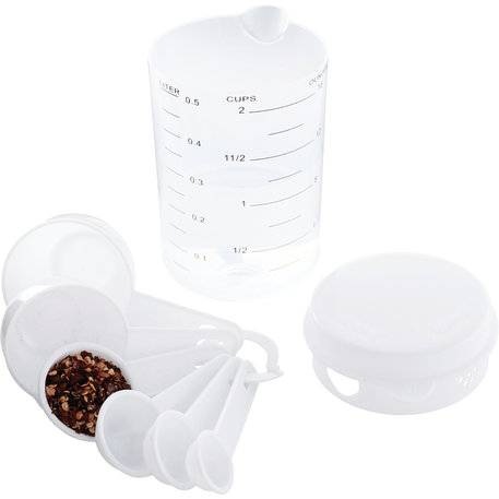 The 7 Piece Measuring Set includes a 16 ounce container with a lid that offers strain, pour or close options. Includes measuring spoons inside the container. Polypropylene. This set meets FDA requirements and is BPA free.