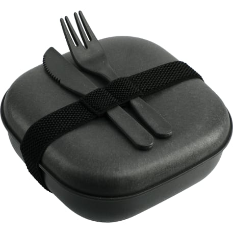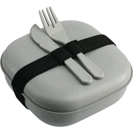 The Wheat Straw Food Storage with Utensils comes equipped with a band to hold the lid and utensils in place. Container is microwave safe. Do not put band or utensils in microwave. Through a partnership with 1% For The Planet, one percent of sales of this and all EcoSmart products will be donated to nonprofits dedicated to protecting the planet.