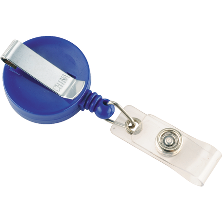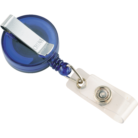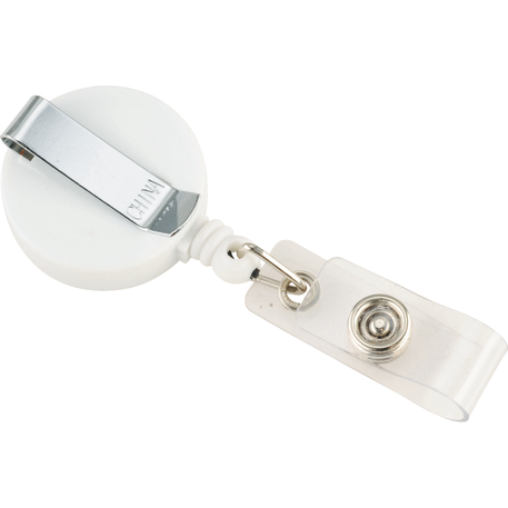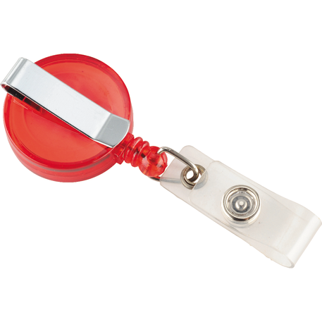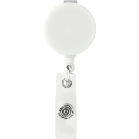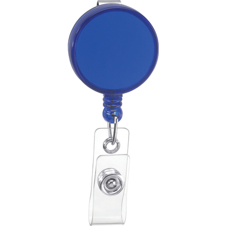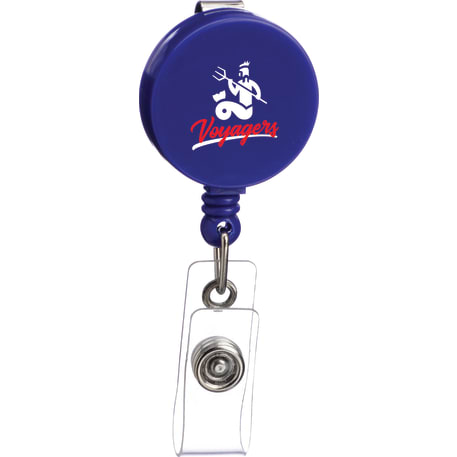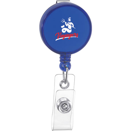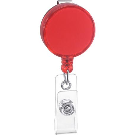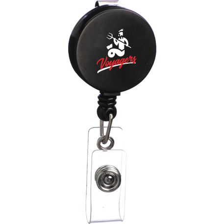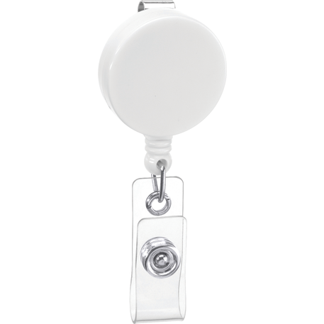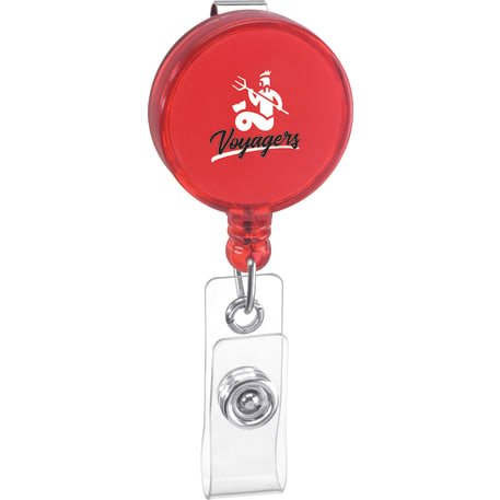 Retracting cord extends 32". Belt clip on back. Great for tradeshows and employee badges. Can also be used as a key ring holder.
