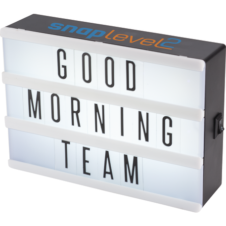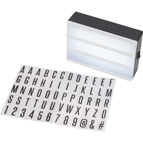 The Cinema Light Box lets you create your own message with this decorative light box. It includes 60 letters and symbols and an On/off switch located on the side of light box. Includes 3x AAA batteries and white gift box.