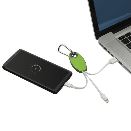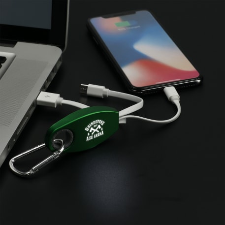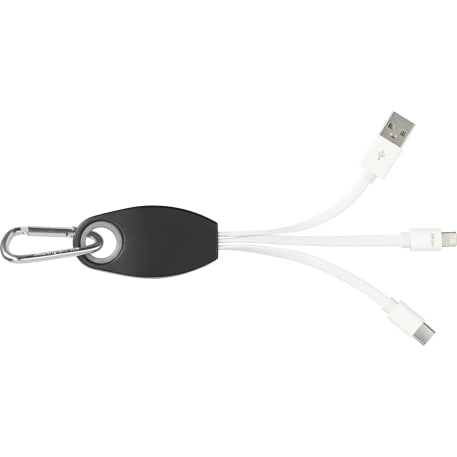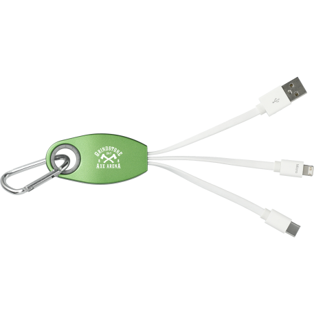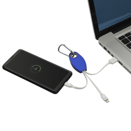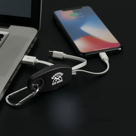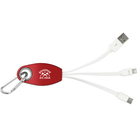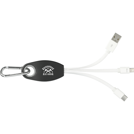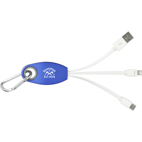 The Trebel 3-in-1 Light Up Logo Charging Cable features a USB A tip, a USB Type C tip, and a 2-in-1 dual compatible tip for both Apple® iOS and Android devices with 1.5A current. This item must be lasered to reveal the light up function. It comes with a carabiner.