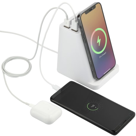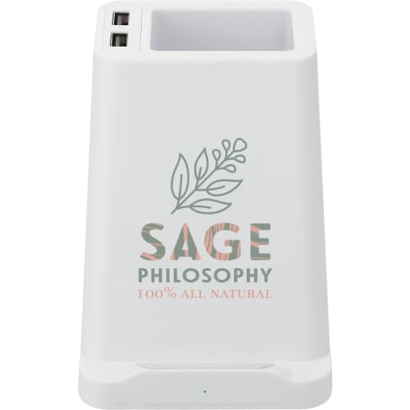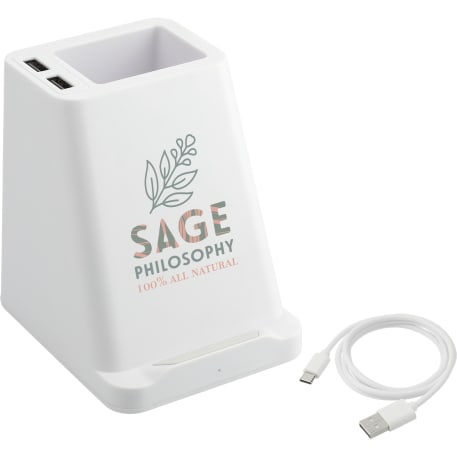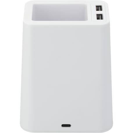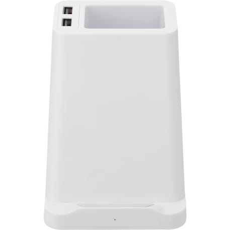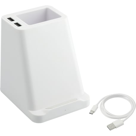 The Wireless Charging Pen Holder with Dual Outputs is a perfect desktop organizer that allows to charge your smartphone vertically without the cables and charge other devices with two USB output ports at the same time. Supports wireless charging at up to 5W for devices including (but not limited to ): iPhone 8/8Plus/X/XS/XS Max/XR/11/11 Pro/11 Pro Max/12/12 Pro/12 Pro Max/12 mini/13/13 Pro/13 Pro Max/13 Mini * Samsung Galaxy Note5/S6/S6 Edge/S6 Edge+/S7/S7 Edge/S8/S8+/S9/S9+/Note9 * Google Nexus 5/6/7 * HTC Droid DNA 8X * LG G3/G4, Lucid 2/3 * Nokia Lumia 920/930 *. To charge an iPhone series before iPhone 8 with wireless technology, an external wireless charging receiver or receiver case is required. Works with most plastic phone cases on. Dual outputs: 5V/1.5A max. Includes 39" 3A USB-A-to-Type-C charging cable.