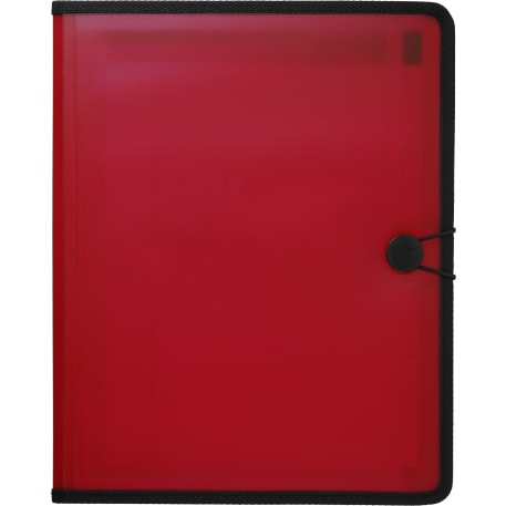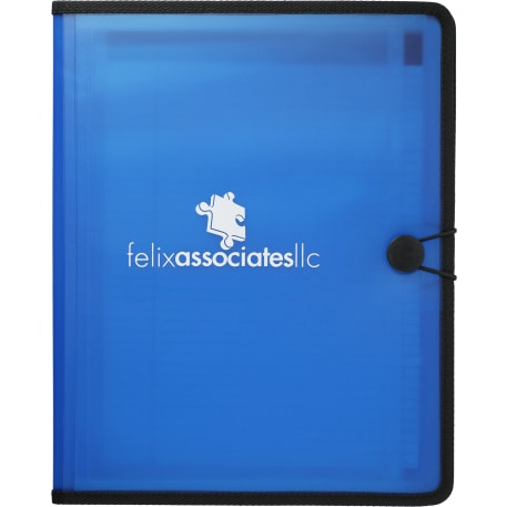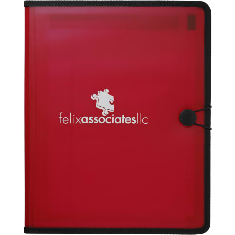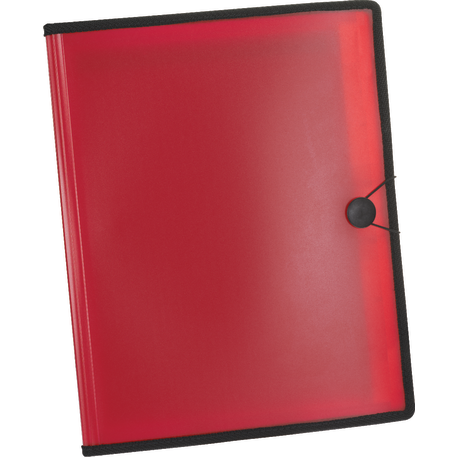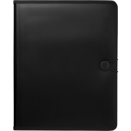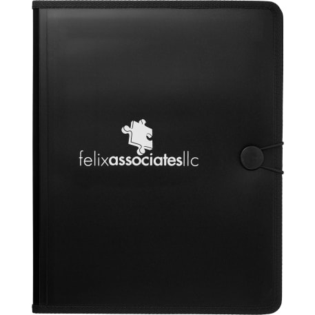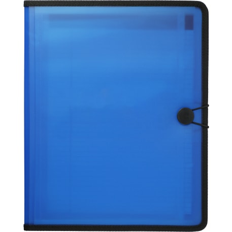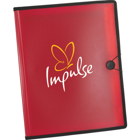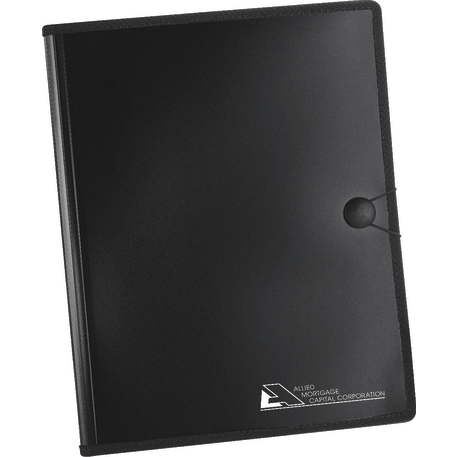 The Plastic Padfolio features a refillable, 30 page ruled notepad and includes a translucent cover with black trim and an elastic closure. Notepad size: 8” x 11.5”. It also features an interior pen loop and a clear file divider with 2 business card slots and 2 CD pockets. A pen is not included.