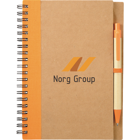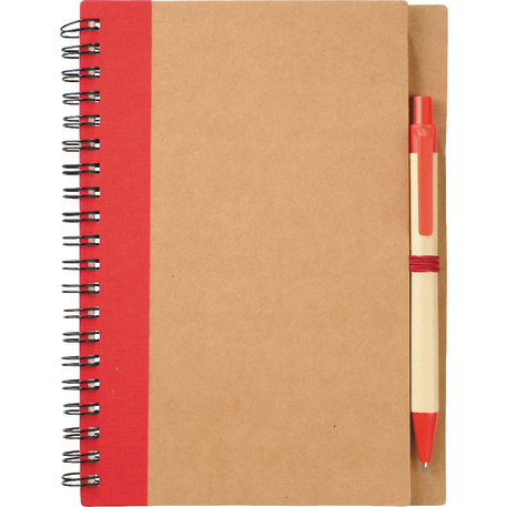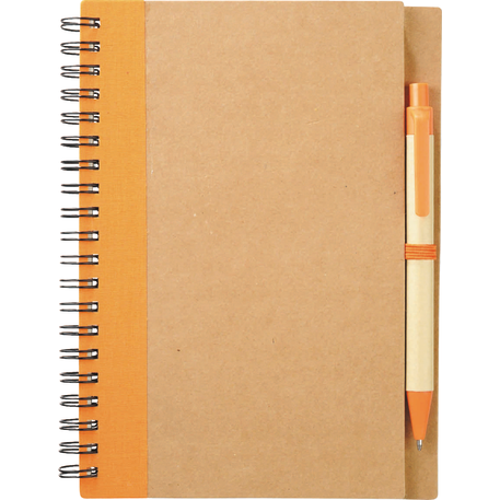 The 5" x 7" Eco Spiral Notebook with Pen features 60 cream ruled pages, a matching color elastic pen loop and a matching ballpoint pen. Hard cover. A pen imprint is not available and all pens are packed separately. Through a partnership with 1% For The Planet, one percent of sales of this and all EcoSmart products will be donated to nonprofits dedicated to protecting the planet. Due to the nature of the material, there may be color variances.