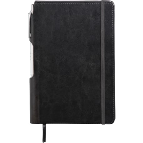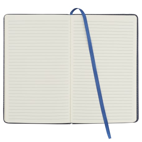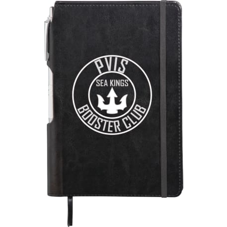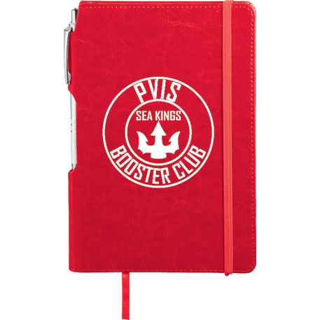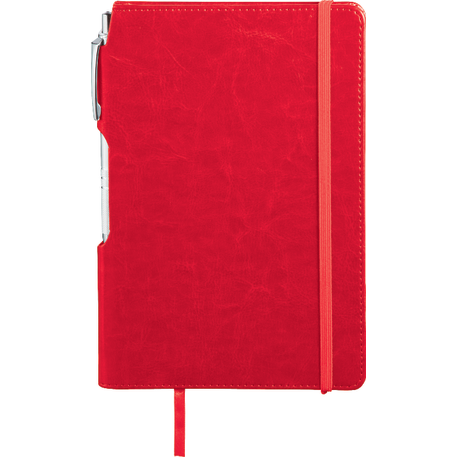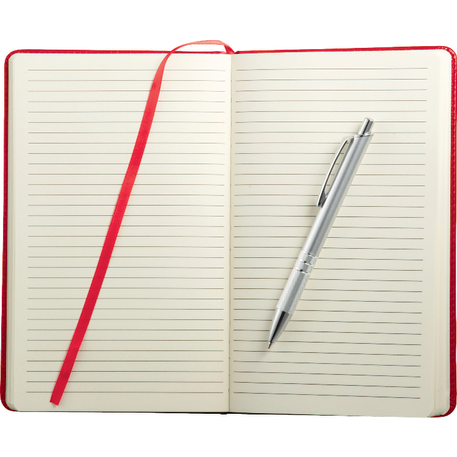 The 6" x 8.5" Viola Bound Notebook with Metal Pen includes 80 cream ruled pages and features an aluminum ballpoint pen and spine pen slot. Ribbon page marker and elastic closure. Hard cover. A pen imprint is not available.
