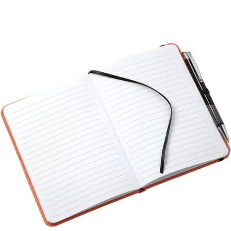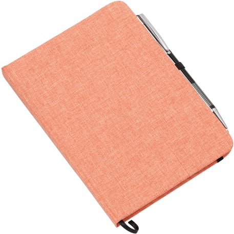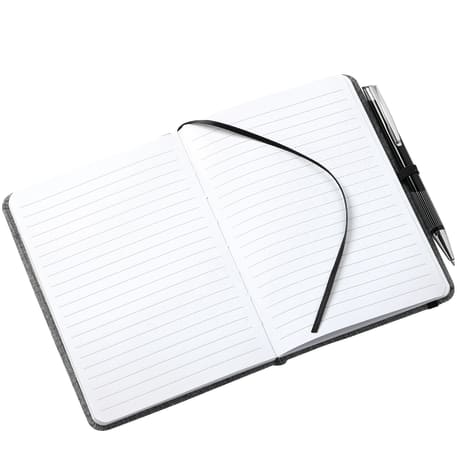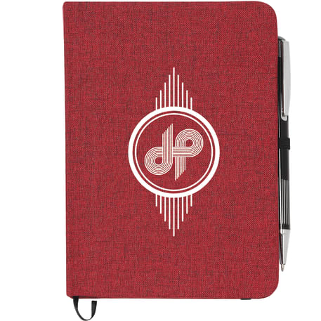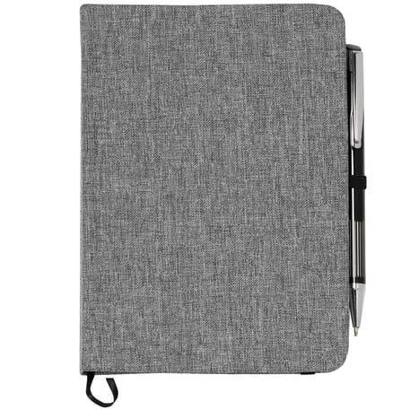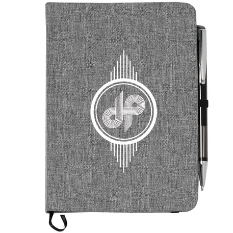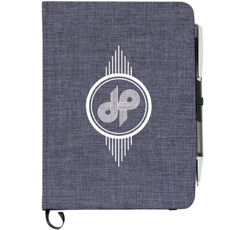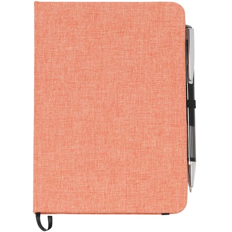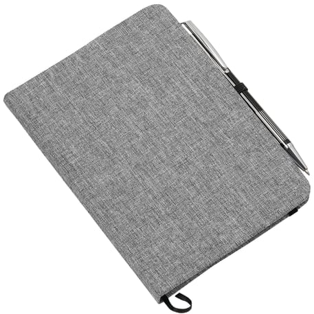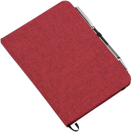 The 5" x 7" Heathered Bound Notebook is a hard heathered canvas covered bound notebook with 80 sheets of white lined paper. Elastic pen loop included and ribbon marker included.