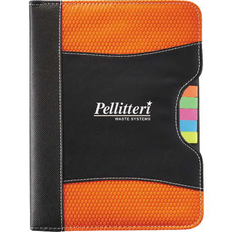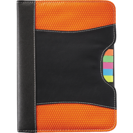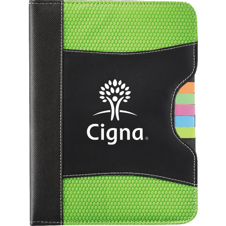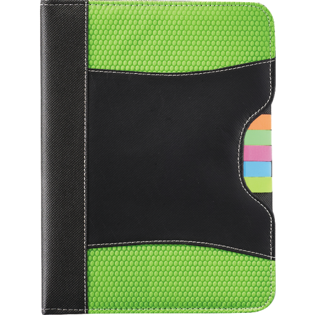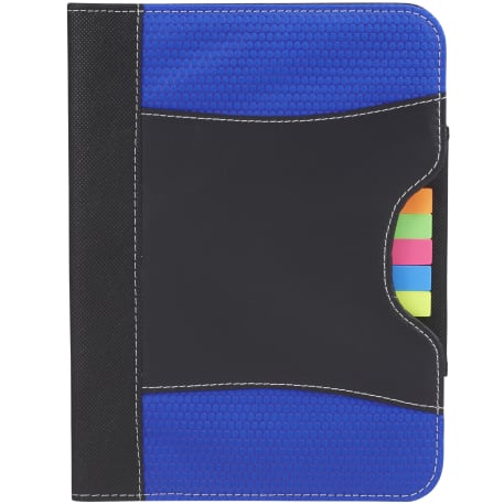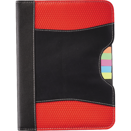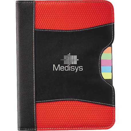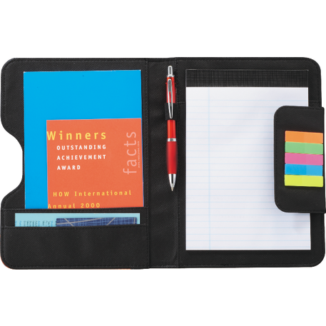 The Flare Organization Jr. Padfolio features five assorted color sticky flags and an inside cover panel that contains two business card pockets and an elastic pen loop. It also includes a refillable, 30 page and 8” x 5.5” notepad. A pen is not included.
