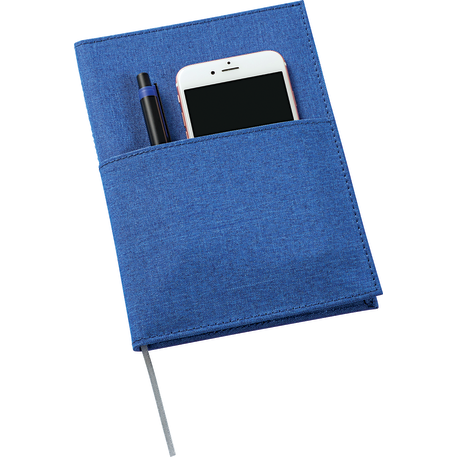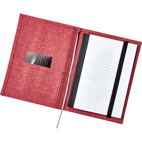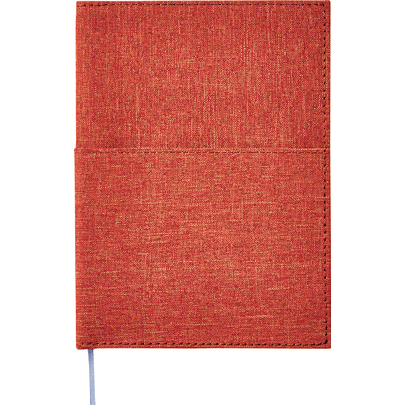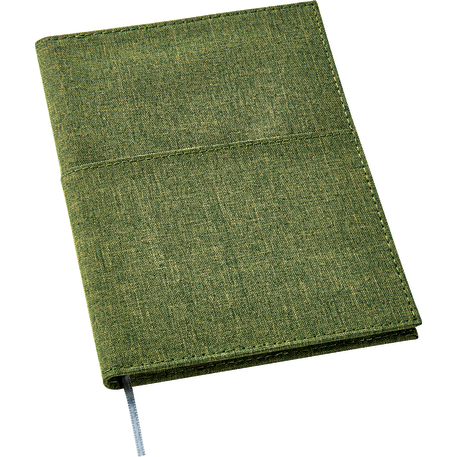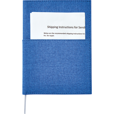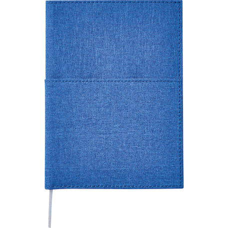 Canvas, refillable notebook with front and back pocket for storing business cards, smartphone, pens, etc. Ribbon page marker. 50 sheets of white lined paper. Hard, fabric cover.