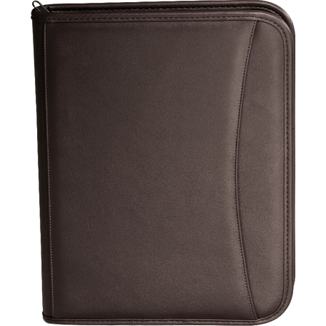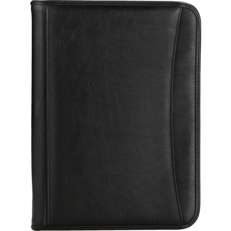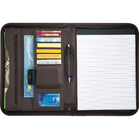 The Presidential Padfolio features a zippered cover and includes a refillable, 30 ruled page 8.5” x 11.5” notepad. It also has a front open document pocket, an interior expanding pocket, a document pocket and an additional zippered pocket and pen loop. A pen is not included.