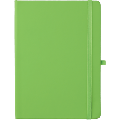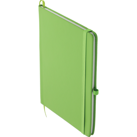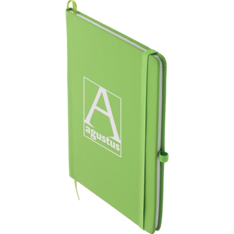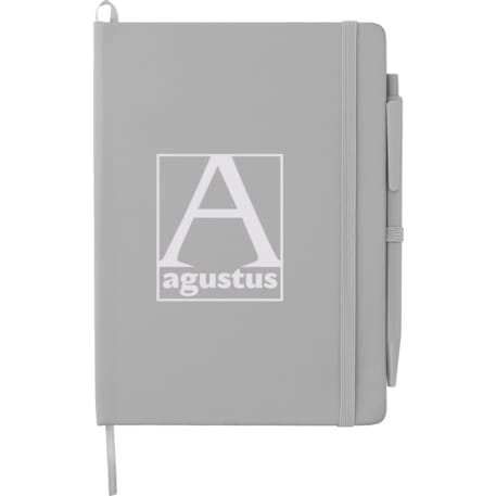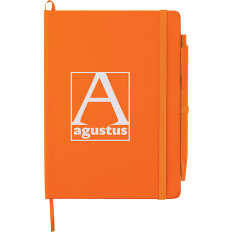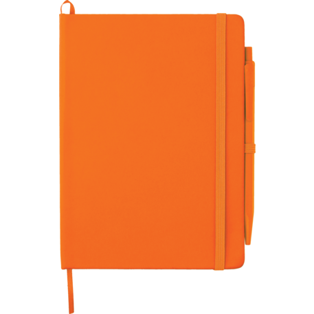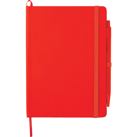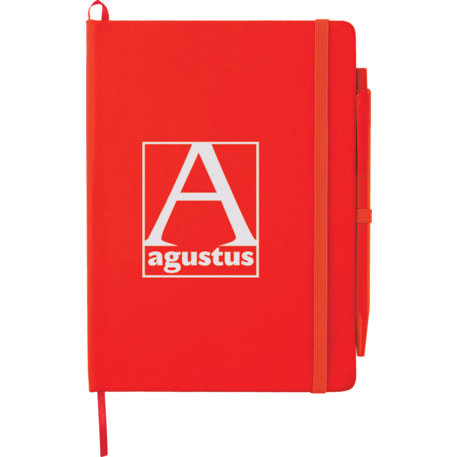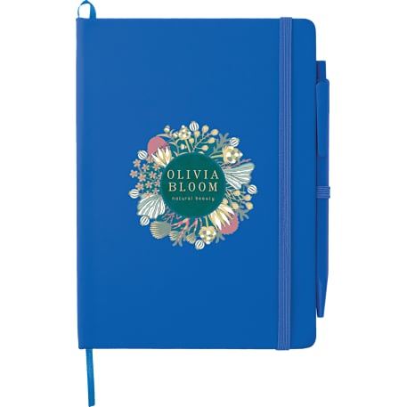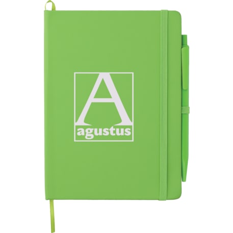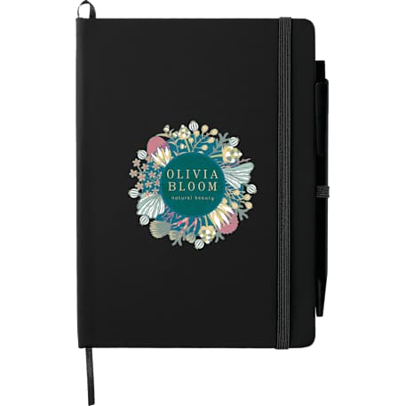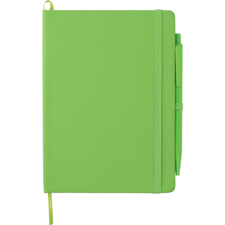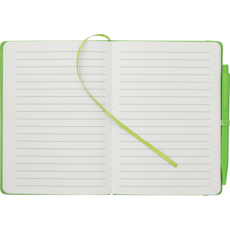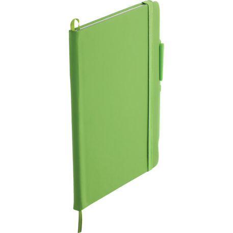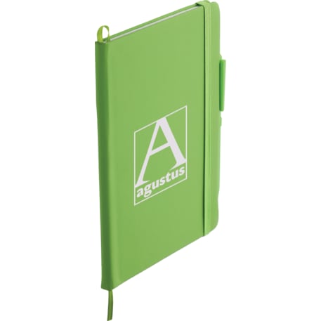 The 5" x 7" Prime Notebook With Pen is a hard bound notebook with color matching elastic closure, ribbon page marker and pen loop. 50 sheets of white lined pages. Color matching pen with black ink cartridge.