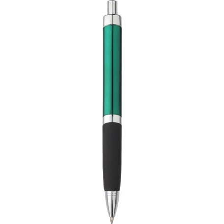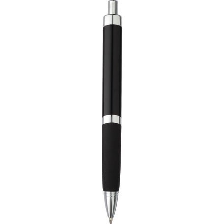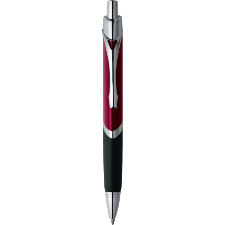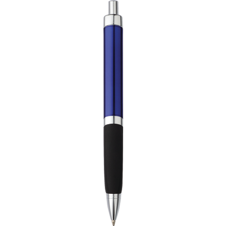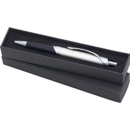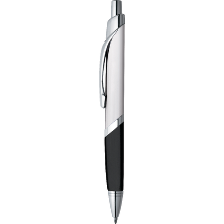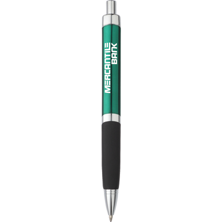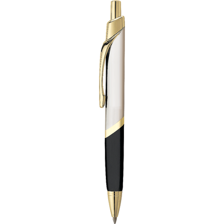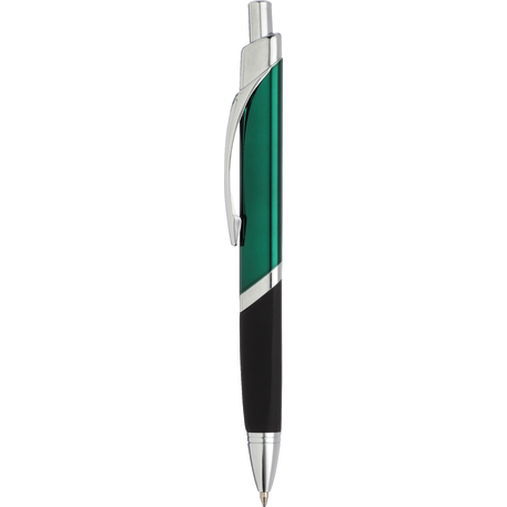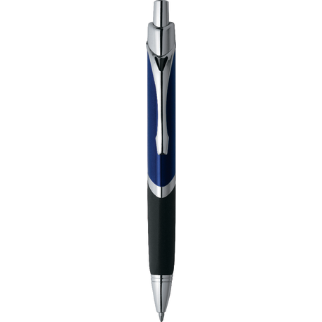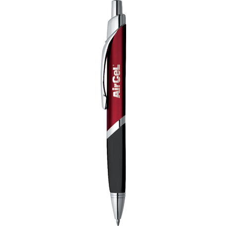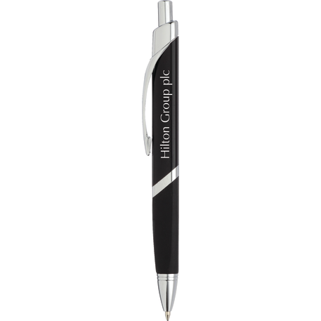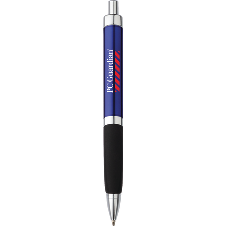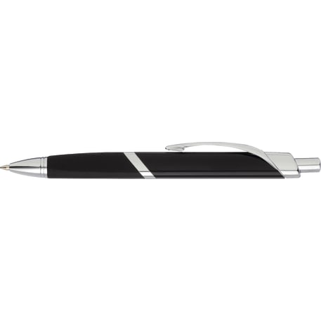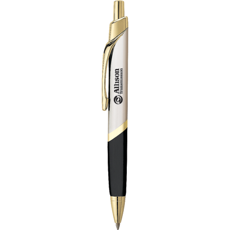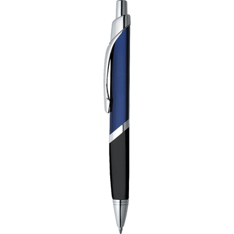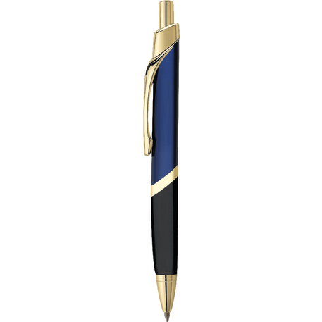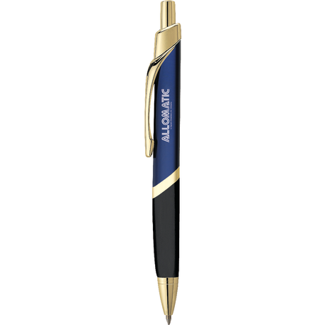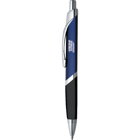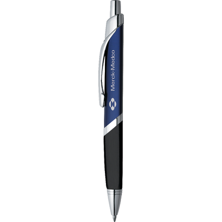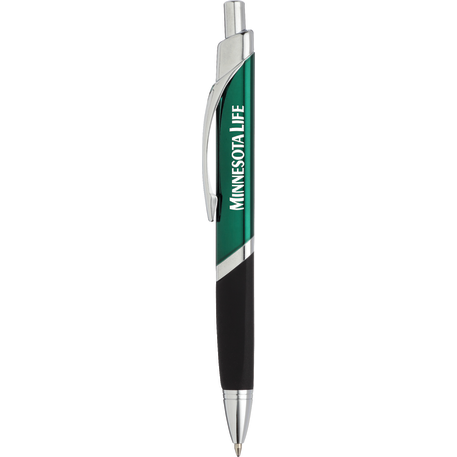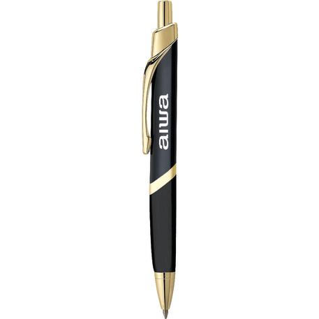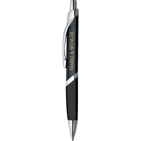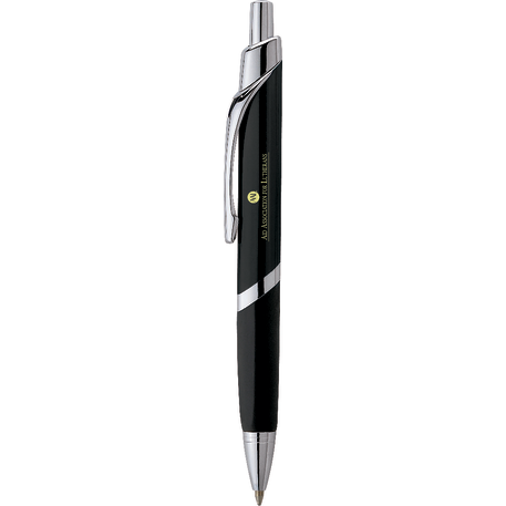 The SoBe Ballpoint Pen has a retractable ballpoint that features a triangular-shaped barrel with chrome trim. It comes in several different colors. This pen features a 1.0mm tip and black/blue ink. Laser finish is shiny brass.