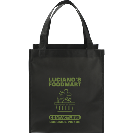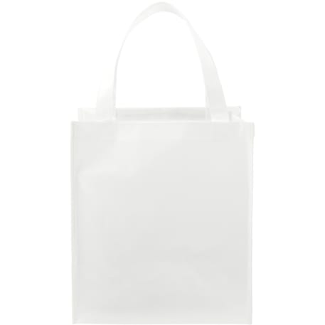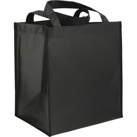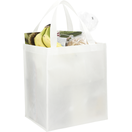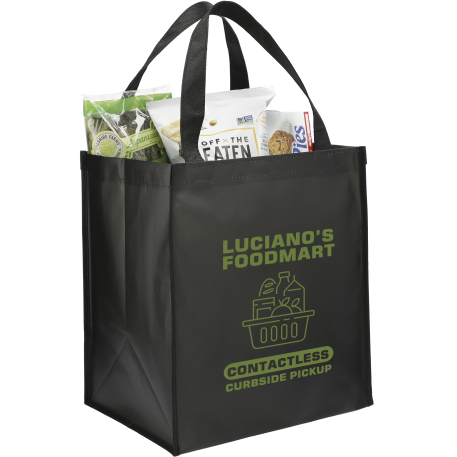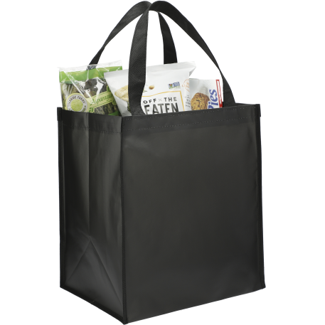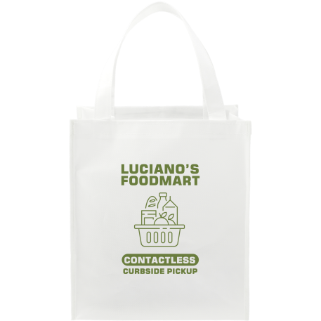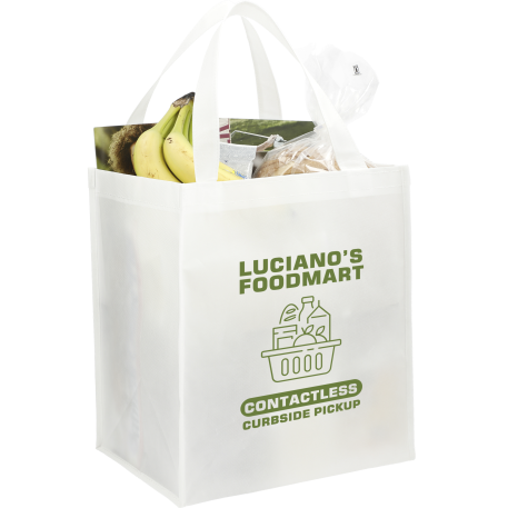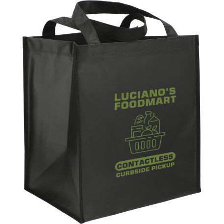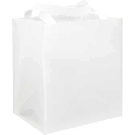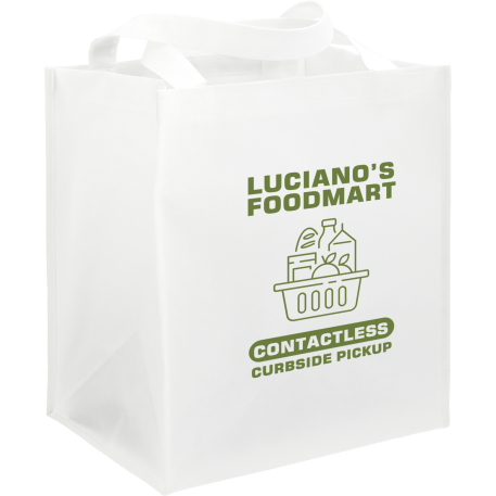 The Double Laminated Wipeable Grocery Tote is the classic grocery tote shape now with a wipeable interior and exterior to protect against germs. This tote has double handles, an open main compartment, and a supportive bottom board. Product dimensions are 15"H x 13"W x 10"D