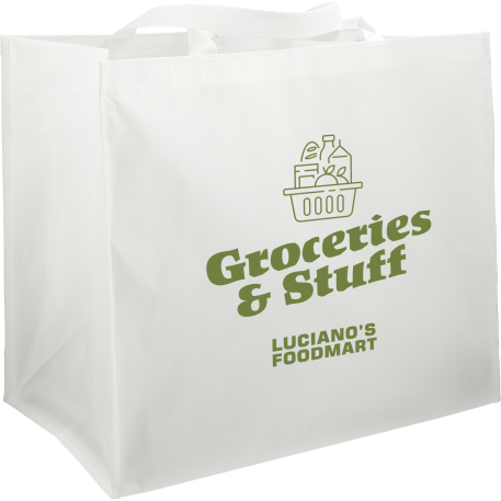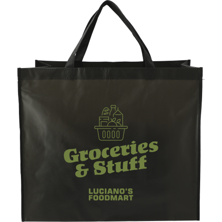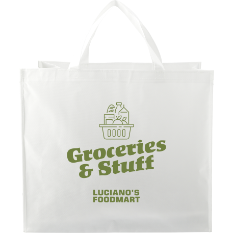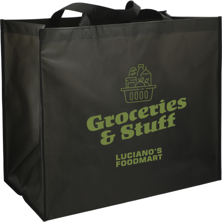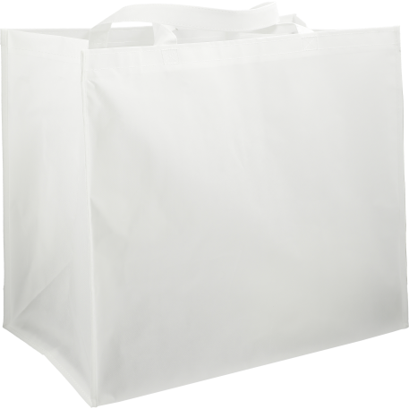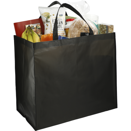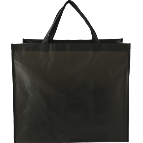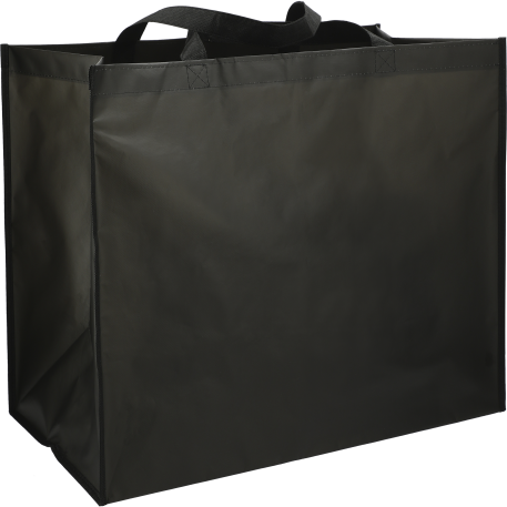 The Double Laminated Wipeable Jumbo Tote is the largest tote at PCNA and is perfect for catering or any other large items. The double lamination makes both the interior and exterior easily wipeable to protect against germs. This tote has double handles, an open main compartment, and a supportive plastic bottom board. Product dimensions are 18"H x 21"W x 12.5"D