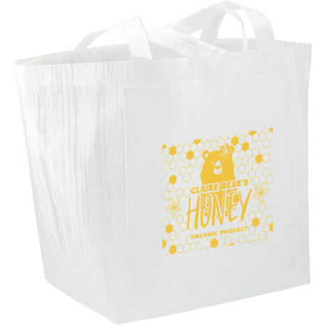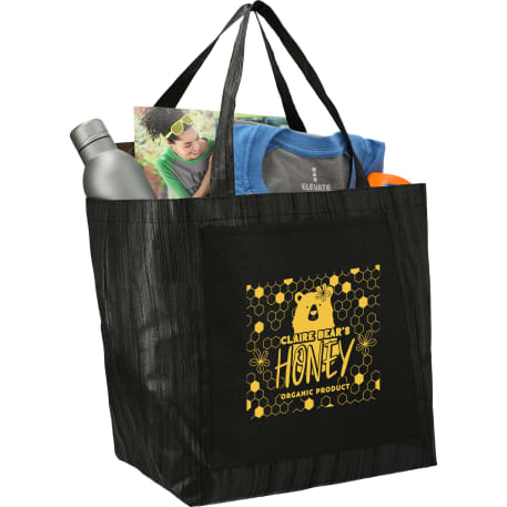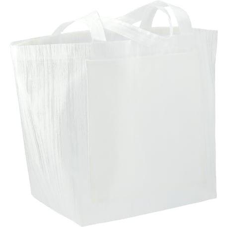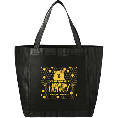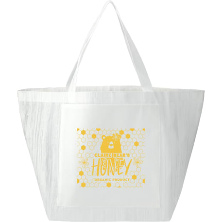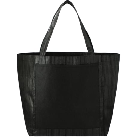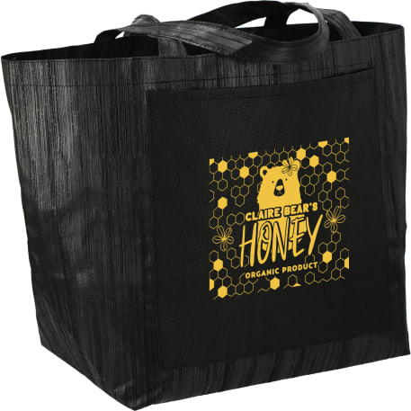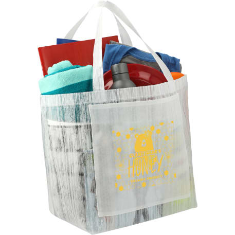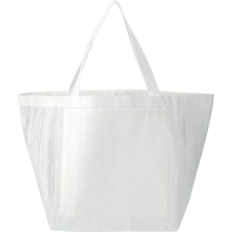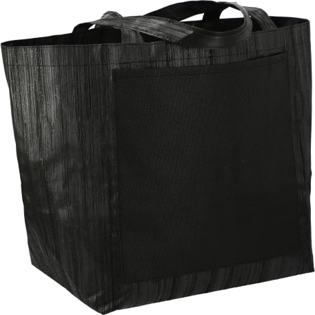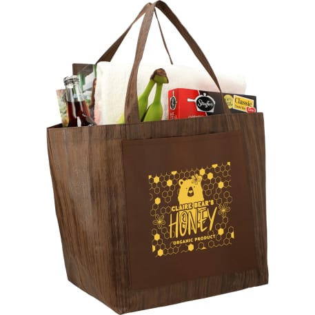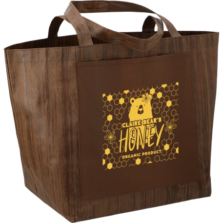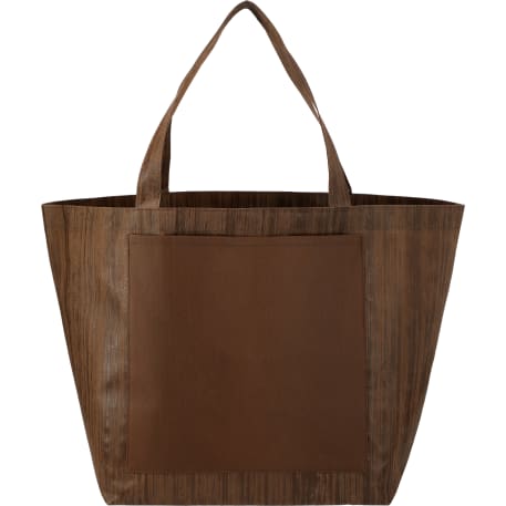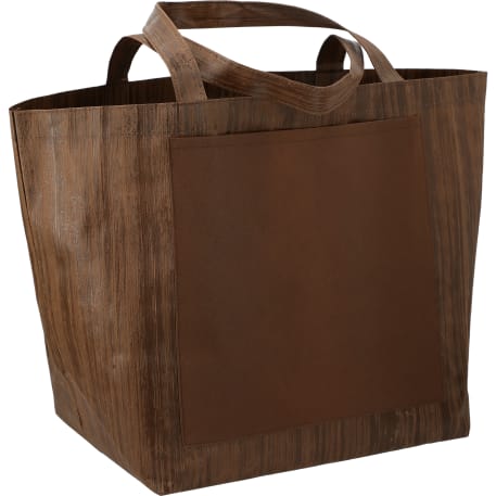 The Forester Non-Woven Shopper Tote features a unique wood-like texture, open main compartment, and front slash pocket. The bag is flared at the top and measures 12"W at the bottom.