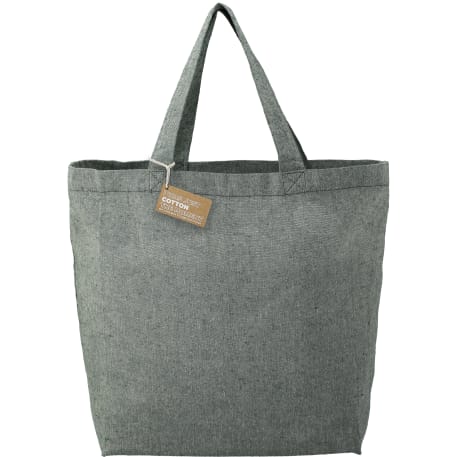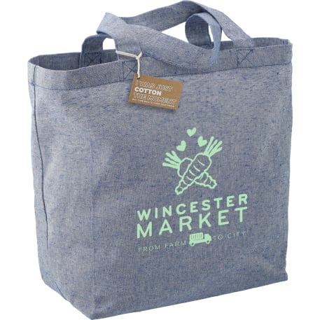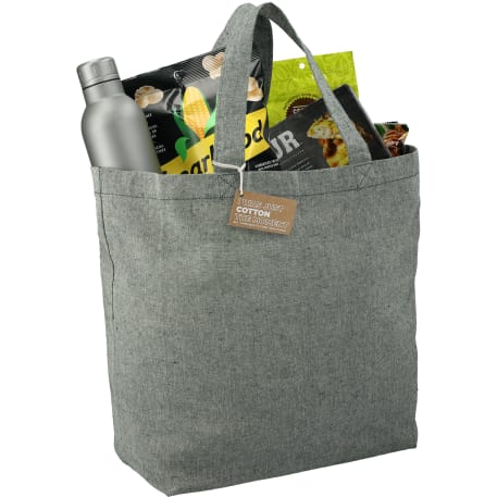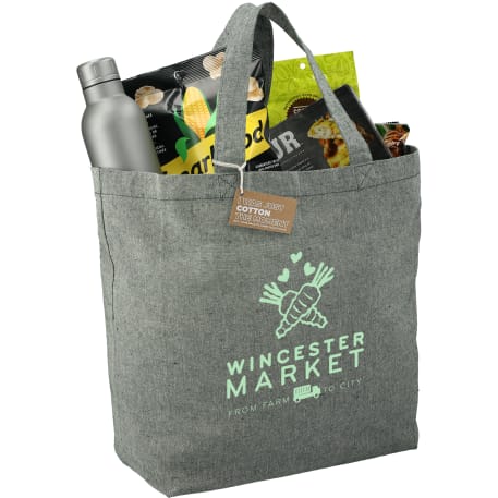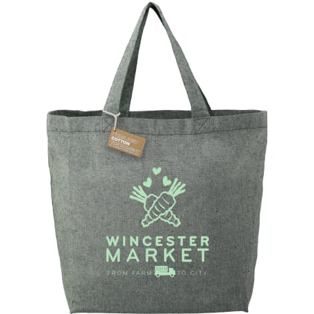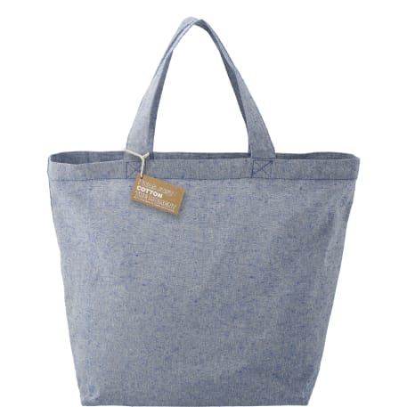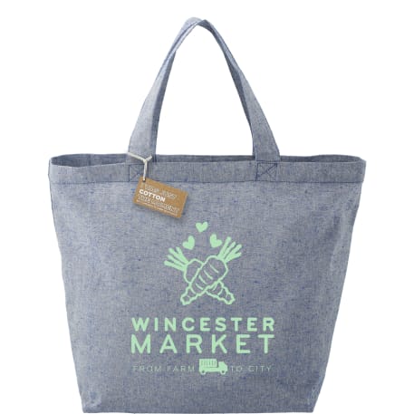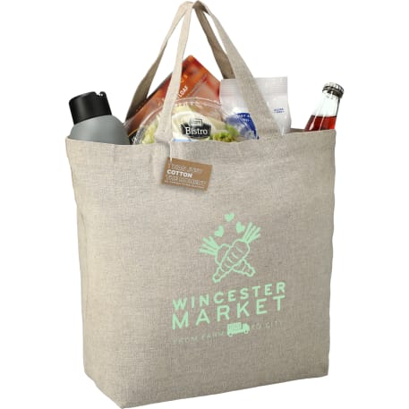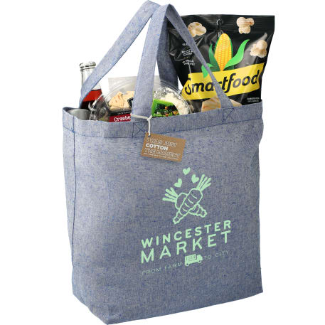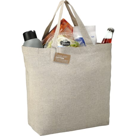 The 5oz Cotton Twill Recycled Grocery Tote will be your go-to tote on grocery day and helps promote social responsibility. It is manufactured from pre-consumer waste generated by factories during the fabric cutting process. Approximately 70%-80% recycled cotton and 20-30% RPET. Through a partnership with 1% For The Planet one percent of sales of this and all EcoSmart products will be donated to nonprofits dedicated to protecting the planet. Comes with a sturdy covered bottom board. Disclaimer: Due to the natural materials used in the manufacturing of this product, this bag will have a slight scent that will dissolve over time.
