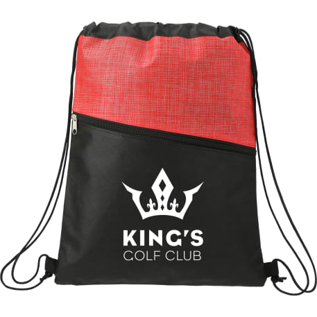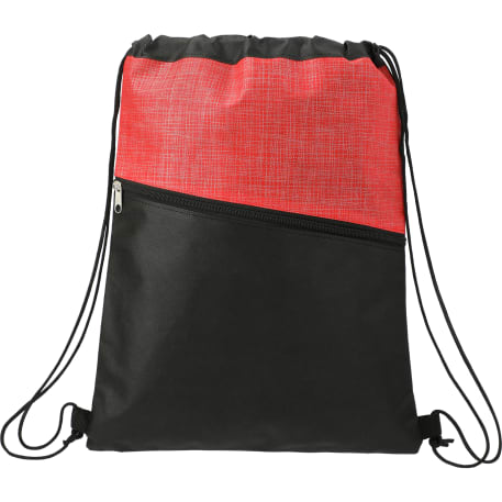 The Cross Weave Zippered Drawstring Bag features a cinch closure, zippered front pocket, and a trendy, metallic cross weave pattern.