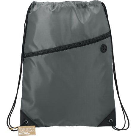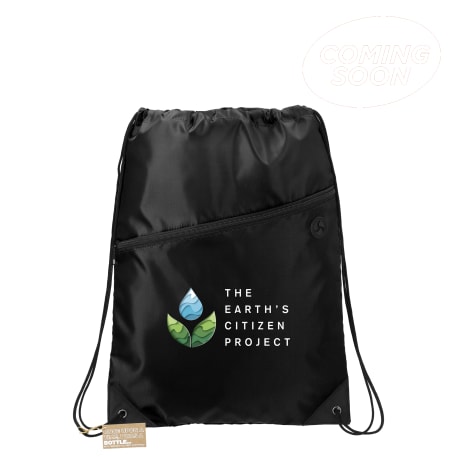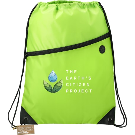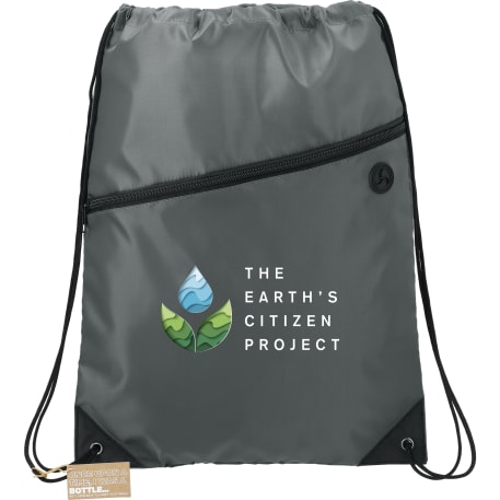 The Robin RPET Drawstring Bag has a large main compartment with a cinching rope closure. The zippered front pocket also features an earbud port and reinforced corner tabs. This bag is manufactured from 100% recycled 210d polyester, made from water bottles. Through a partnership with 1% For The Planet one percent of sales of this and all EcoSmart products will be donated to nonprofits dedicated to protecting the planet.