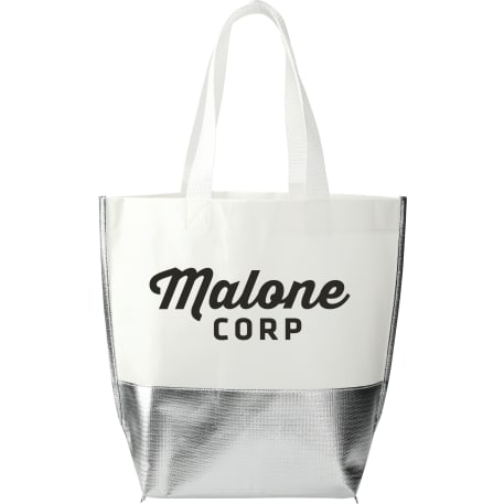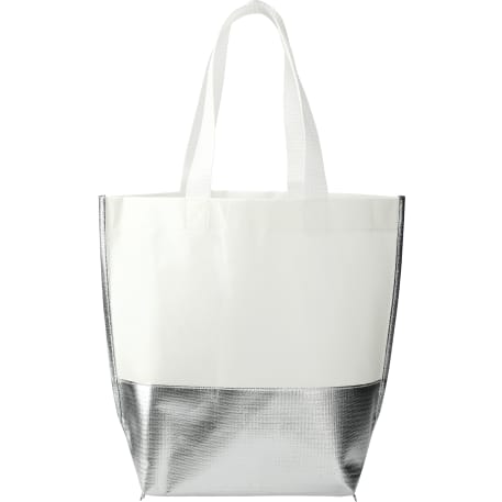 The Large Laminated Metallic Bottom Tote features a large open main compartment that is accented with a metallic bottom panel. The webbed 10" drop grab handles allow for easy carry. This tote makes a perfect, reusable alternative to plastic bags. This tote was previously Leed's 2301-54, Large Laminated Metallic Bottom Tote.