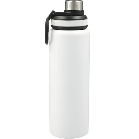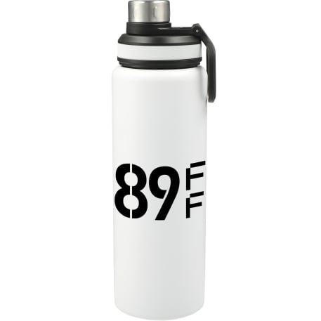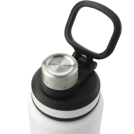 Durable, single-wall, stainless steel construction. On-trend matte coating. Dual opening, screw-on, stainless steel cap on the main lid with silicone band. Also features a built-in, durable, plastic handling loop. Wide opening for comfortable filling and pouring. Perfect for ice cubes. Fits most standard car cup holders. 32oz.