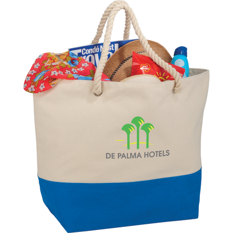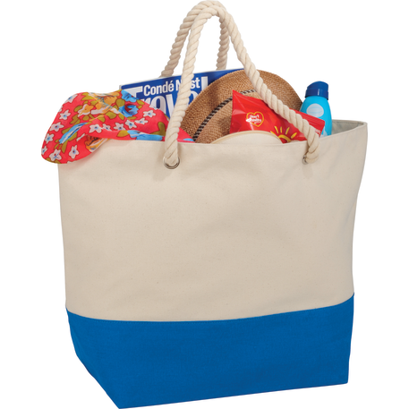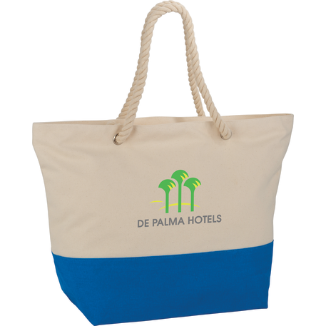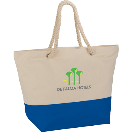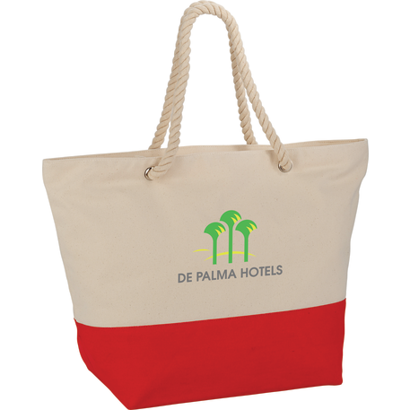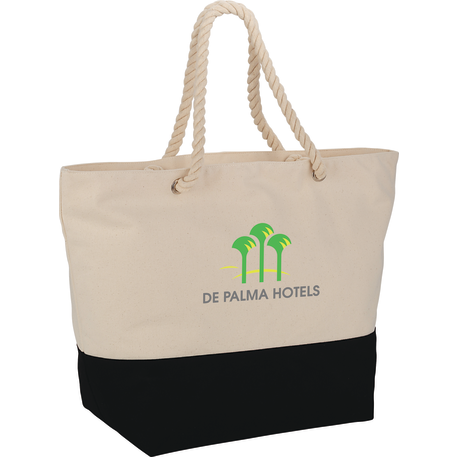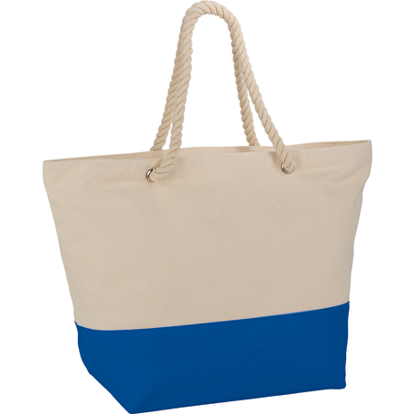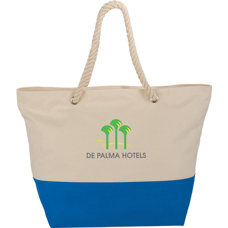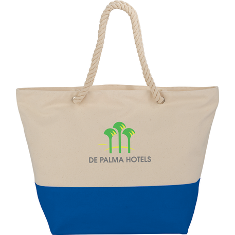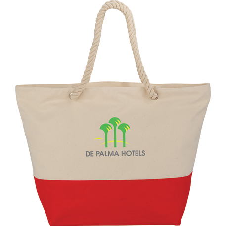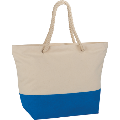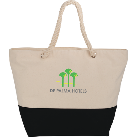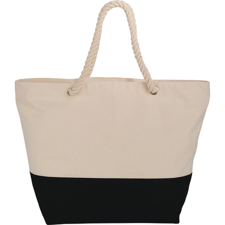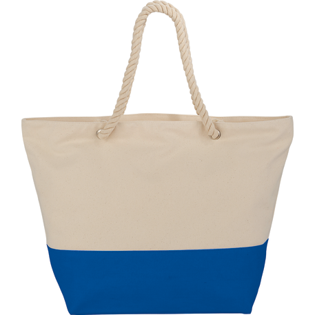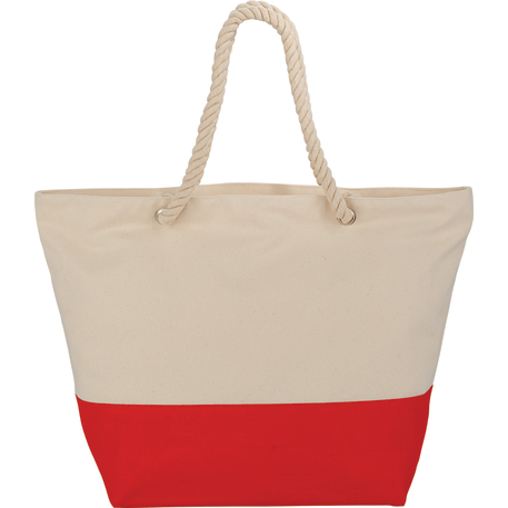 The Zippered Rope Handle 12oz Cotton Canvas Tote has a zippered main compartment with a color accent on the bottom band. The 22 inch soft rope handles also make it easy to carry.