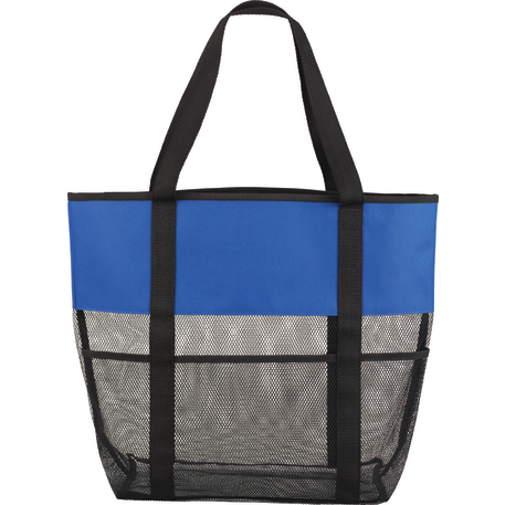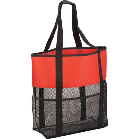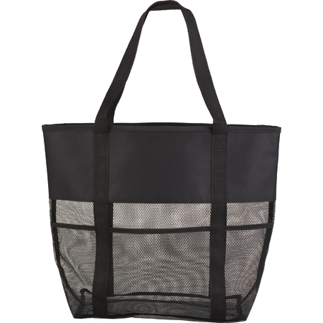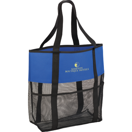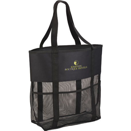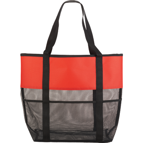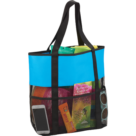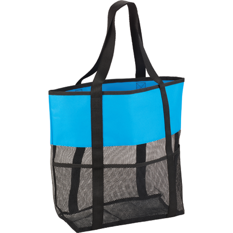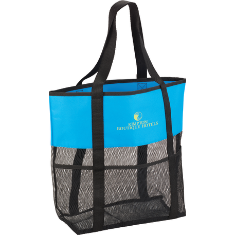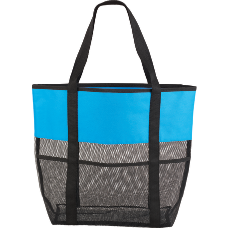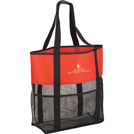 The Utility Beach Tote has an open main compartment with a mesh body that makes it the perfect beach accessory. Utility pockets run around the whole bag allowing for extra space to store a water bottle, magazines and snacks. The mesh bottom even allows for sand to be easily shaken through. Comes conveniently with 23.5 inch handles.