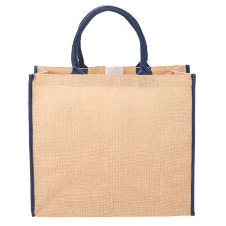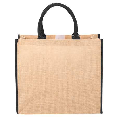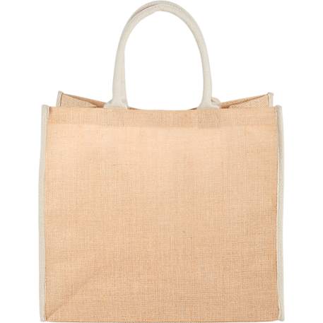 The Large Jute Tote has an open main compartment with hook and loop closure and double 17 inch handles. Disclaimer: Minimum of 32pt. font size. Bold artwork only. No fine graphics or text.
