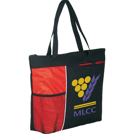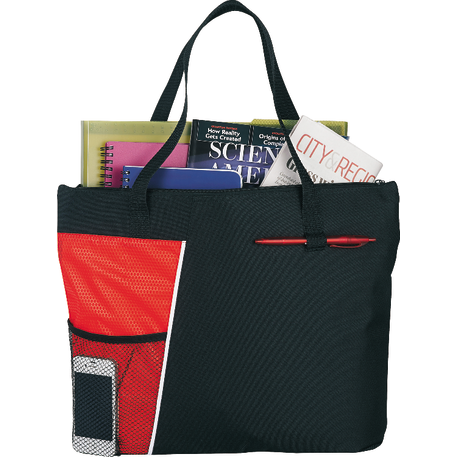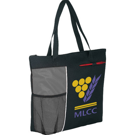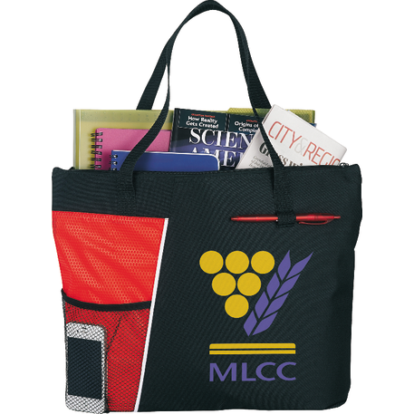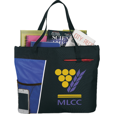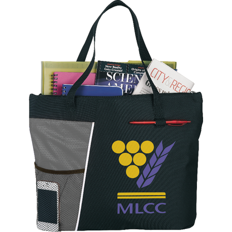 The Touch Base Convention Tote's zippered main compartment has double 20 inch handles a front mesh pocket and a front pen loop.