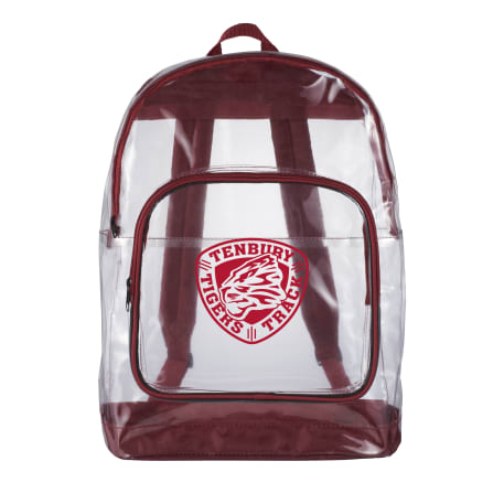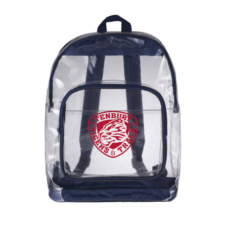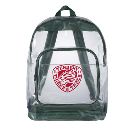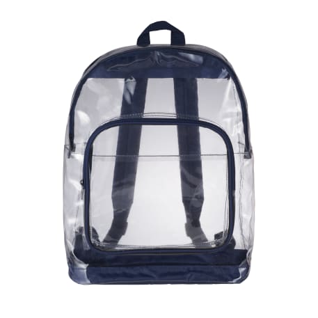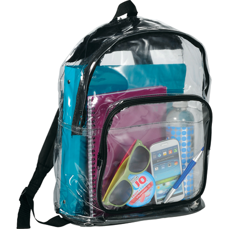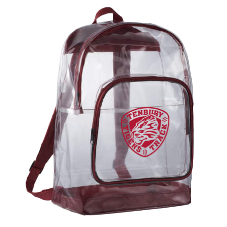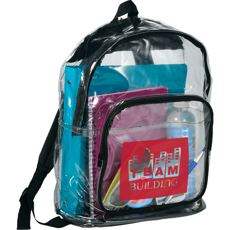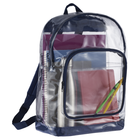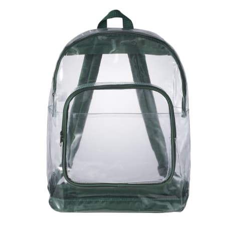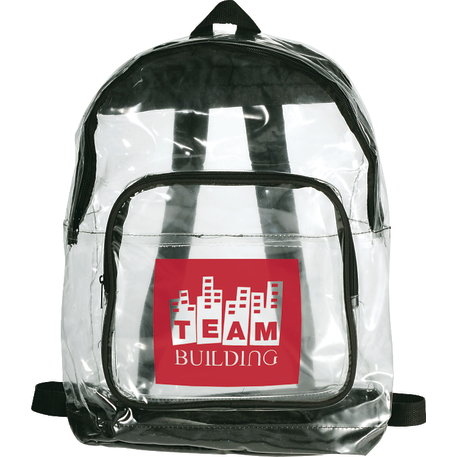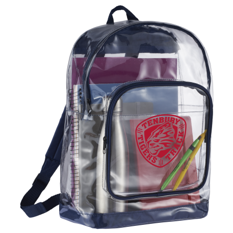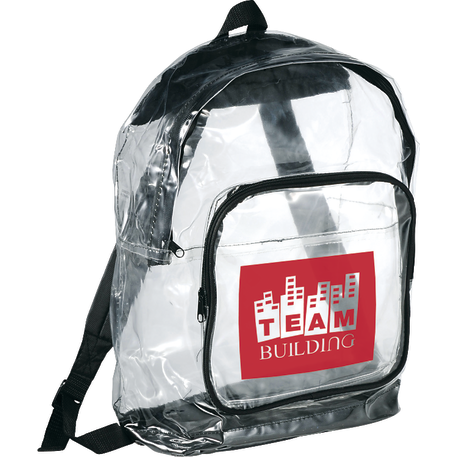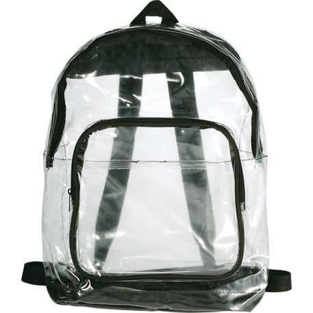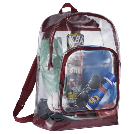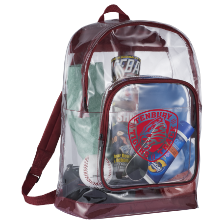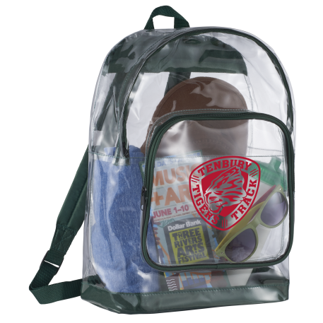 The Rally Clear Backpack has transparent material that makes this bag perfect for stadium, event, workplace and other safety purposes. The large zippered main compartment features a reinforced 210d bottom and a large gusseted zippered front pocket with a protective flap. Adjustable padded shoulder straps and a top carry handle make carrying convenient.