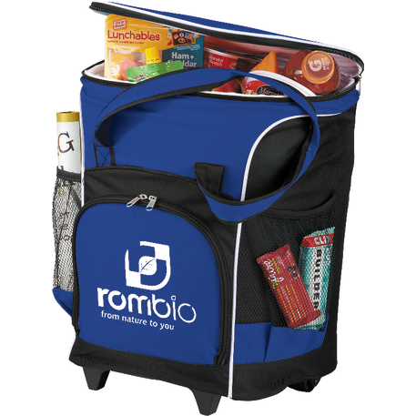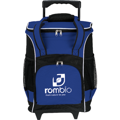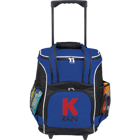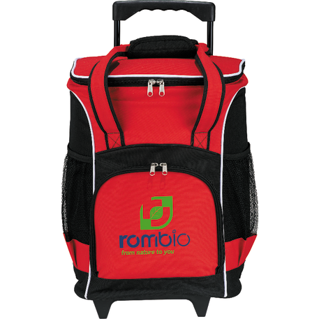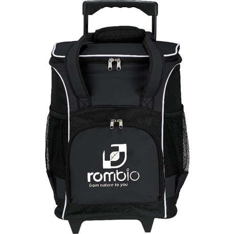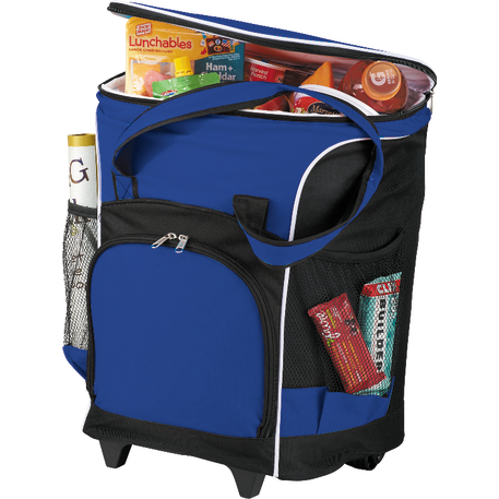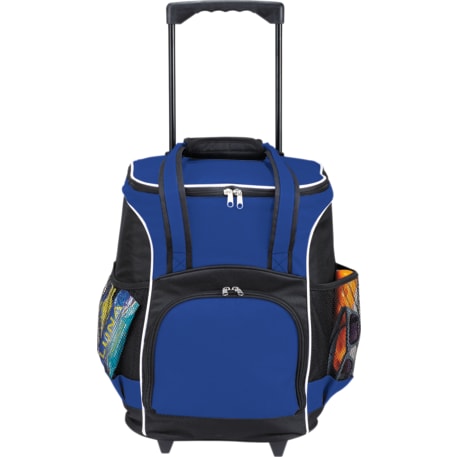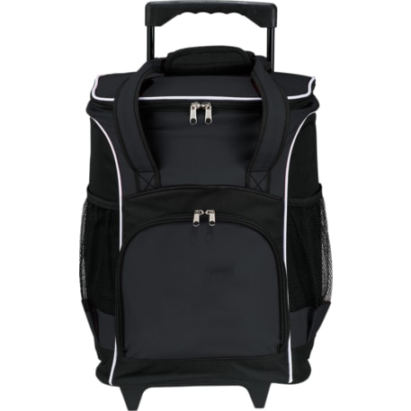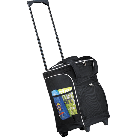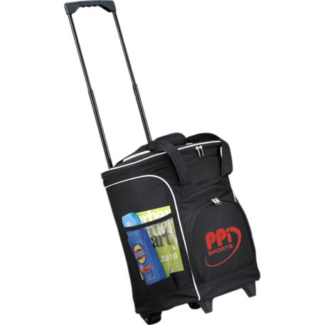 The Rooney 48-Can Rolling Event Cooler comes with PEVA insulation, a large zippered main compartment, a zippered front pocket, two side mesh pockets for extra storage and a retractable telescoping handle that extends 21". Also features inline skate wheels, a bottom board and double carry handles with a hook and loop wrap. It's great for sporting and outdoor events. With Trolley - 18" H x 12.5" W x 12" D