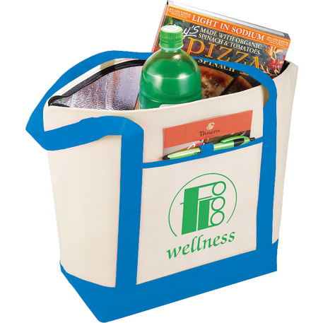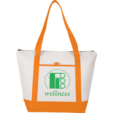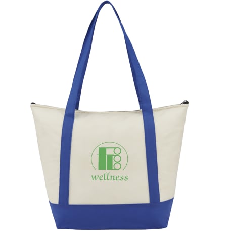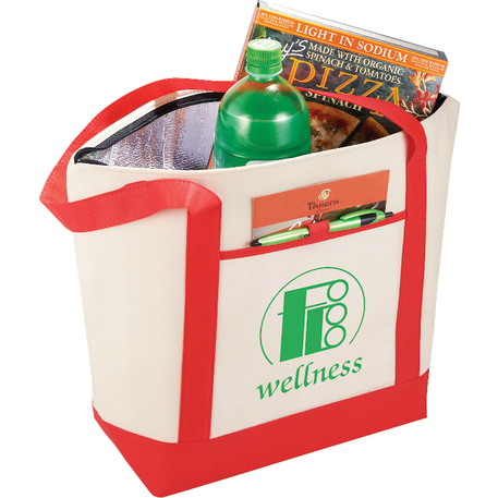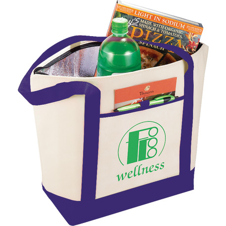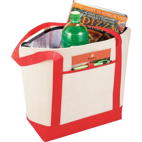 The Lighthouse 24-Can Non-Woven Boat Tote Cooler has a Zippered main compartment with double 24" handles. Open front pocket with pen loop. Foil lining.
