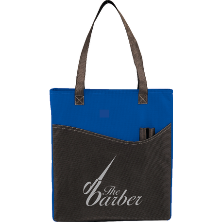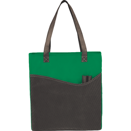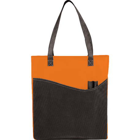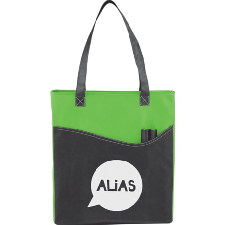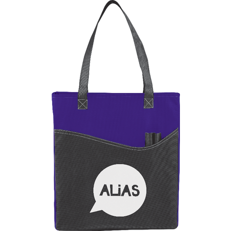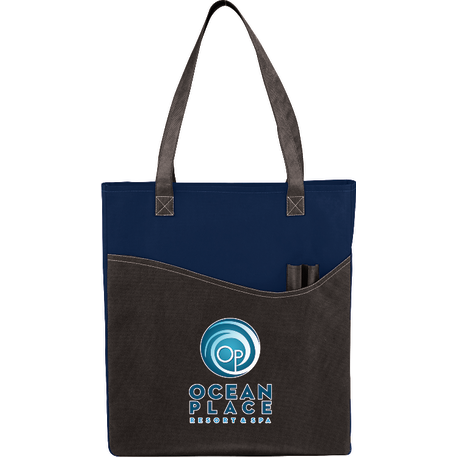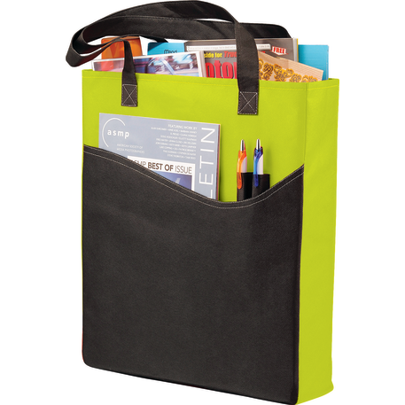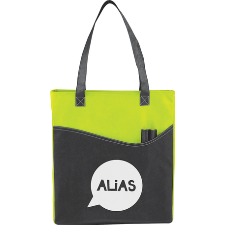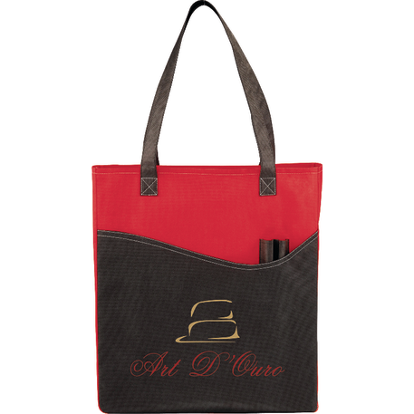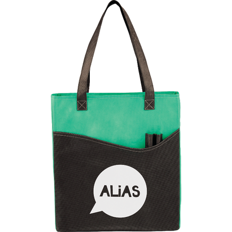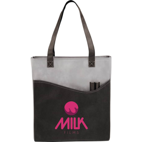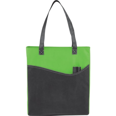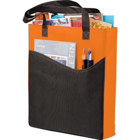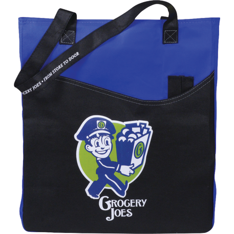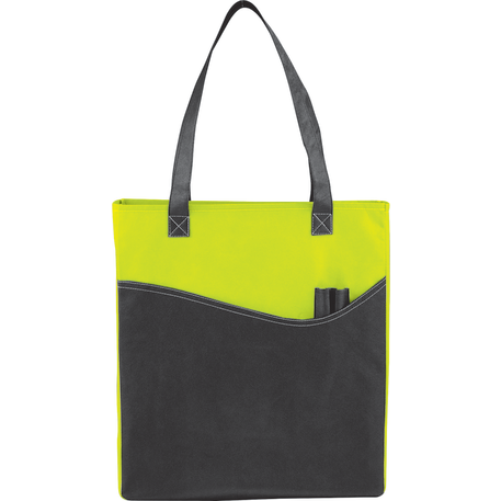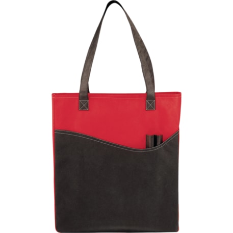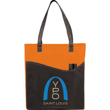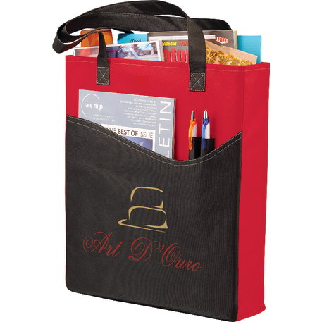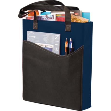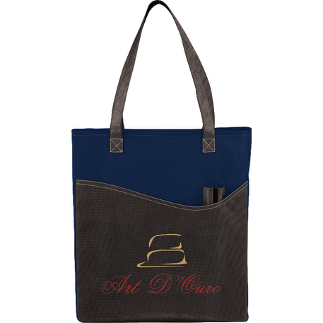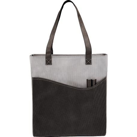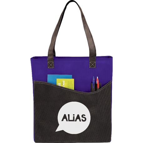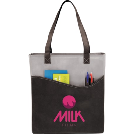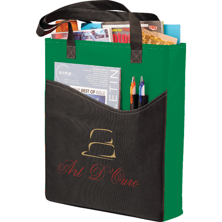 The Rivers Pocket Non-Woven Convention Tote has lots of storage including an open main compartment, front pocket and two pen pockets. Great for tradeshows and conventions, it's also reusable and comes with 26 inch handles. Gusset & Handle Decorating does not qualify for one day turn.