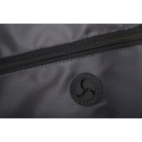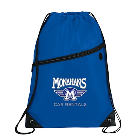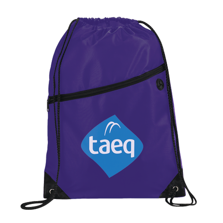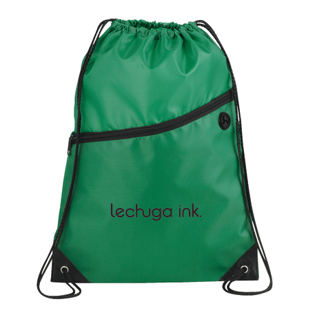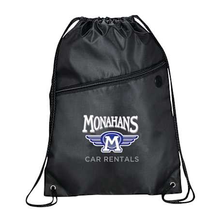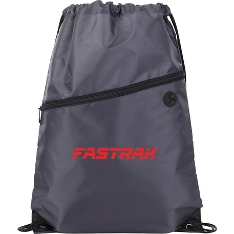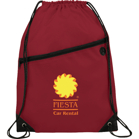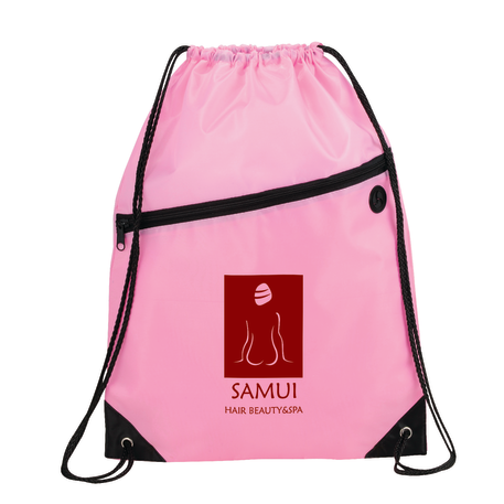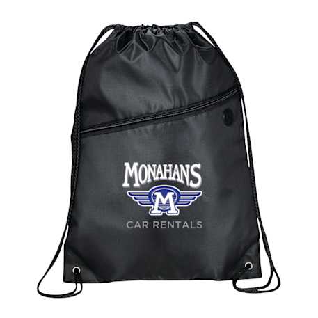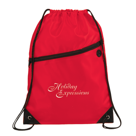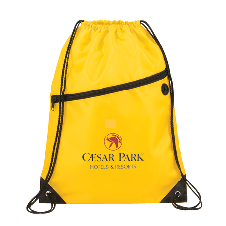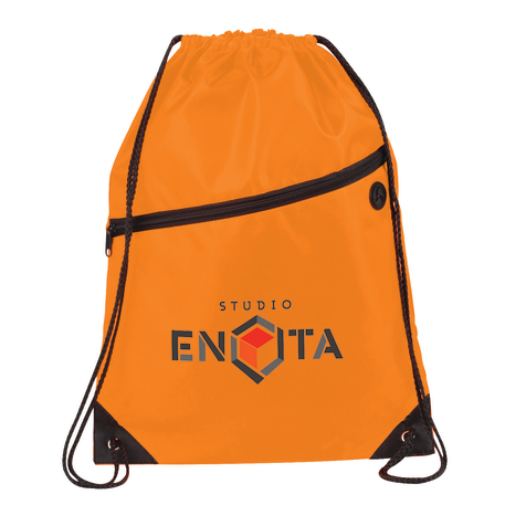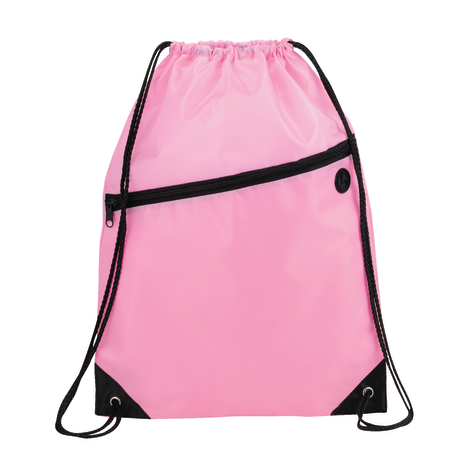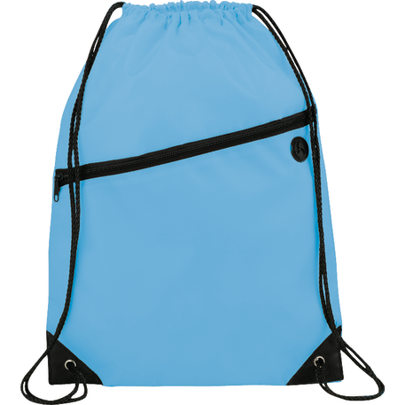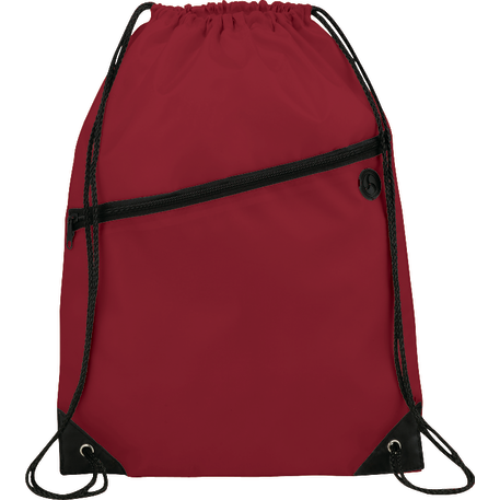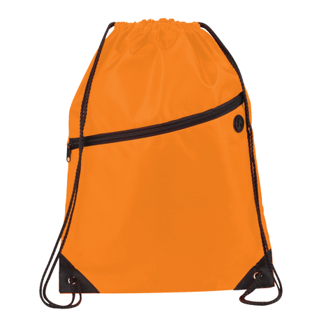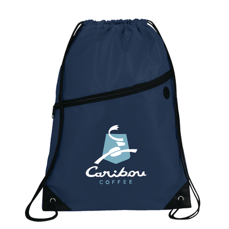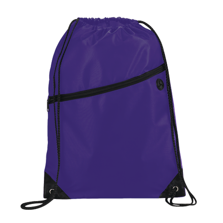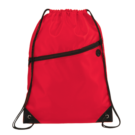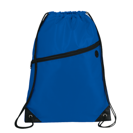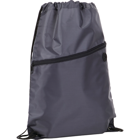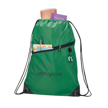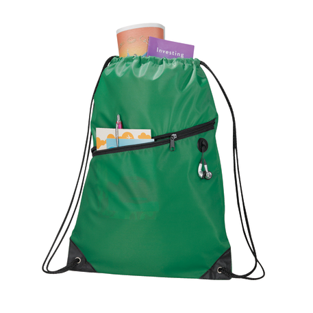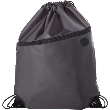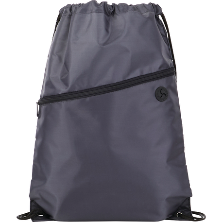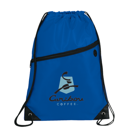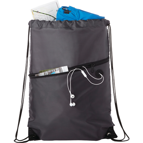 The Robin Drawstring Bag has a large main compartment with a cinching rope closure. The zippered front pocket also features an earbud port and reinforced corner tabs.