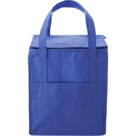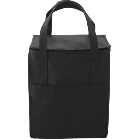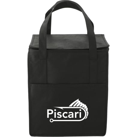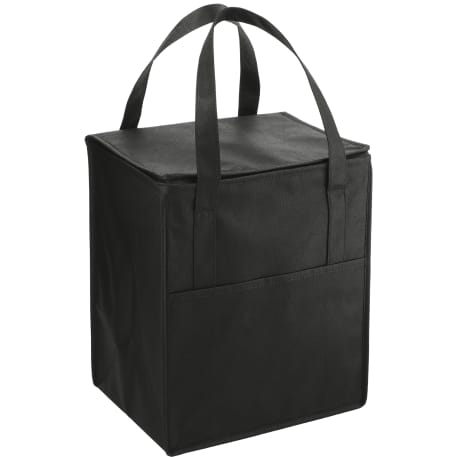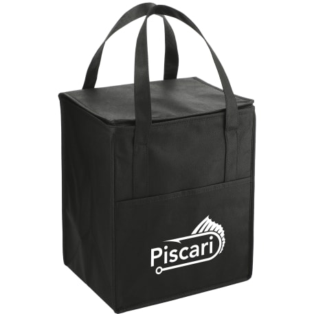 The Hercules Flat Top Insulated Grocery Tote features a large open main compartment and front slash pocket, plus a zippered closure and 22 pound weight capacity. Made from 80gsm non-woven polypropylene.