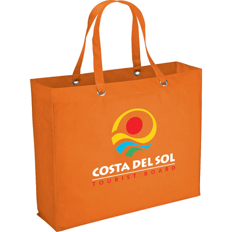 The Oak Non-Woven Shopper Tote has an open main compartment with double 23 inch handles reinforced with metal grommets. Completely reusable it's a great alternative to plastic bags.