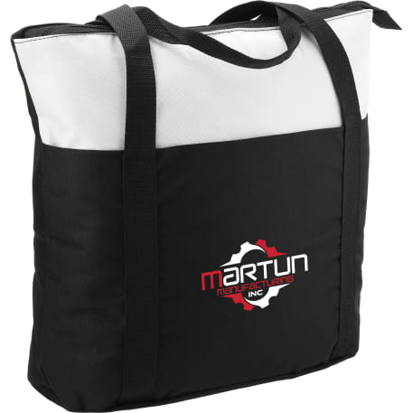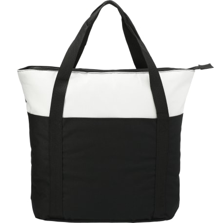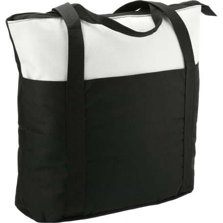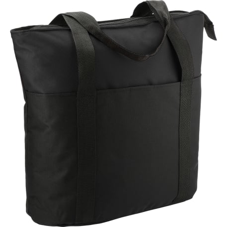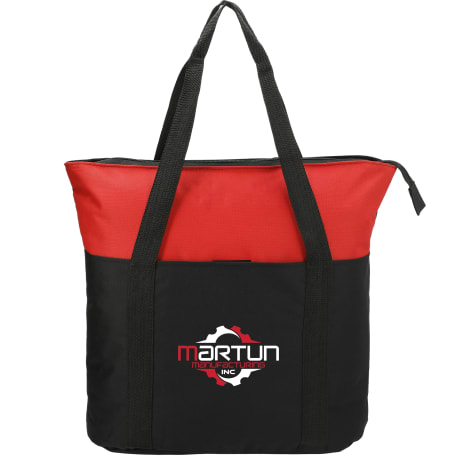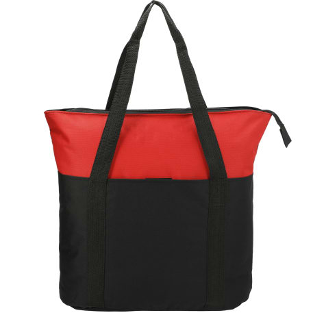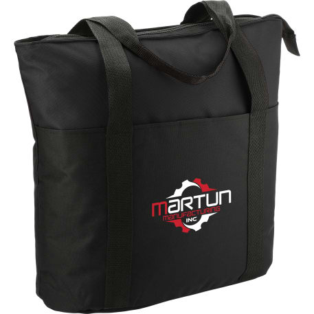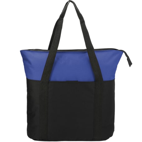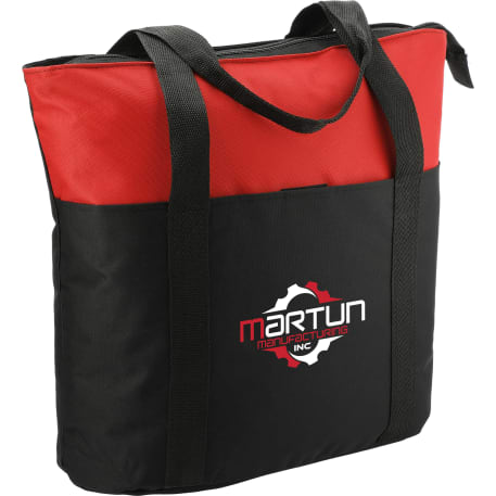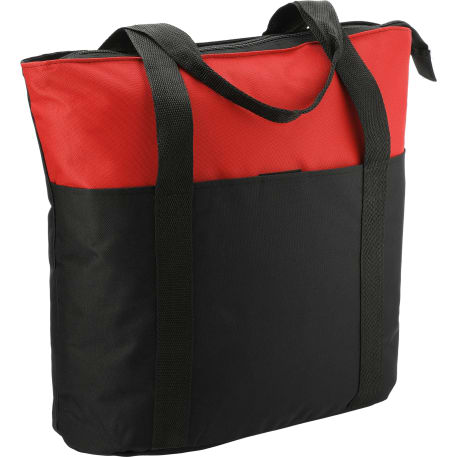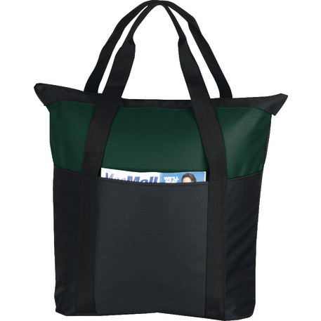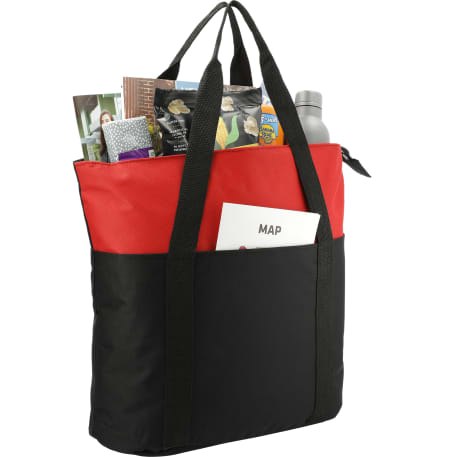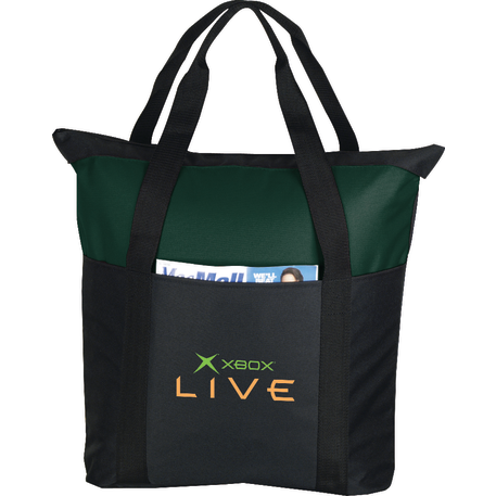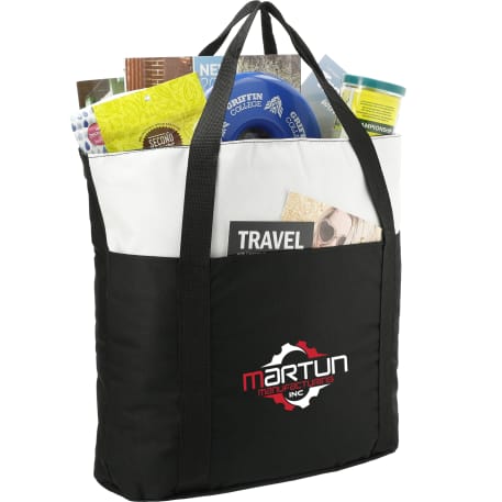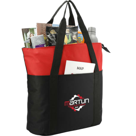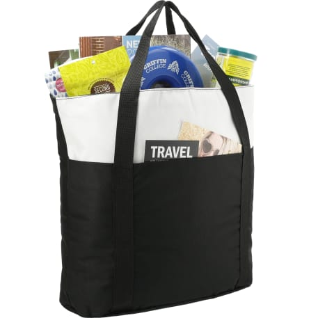 The Heavy Duty Zippered Convention Tote has a zippered main compartment and an interior zippered pocket. It also features a front pocket with a hook and loop closure and double 29 inch handles. Great for conventions, tradeshows and meetings around town.