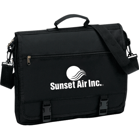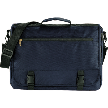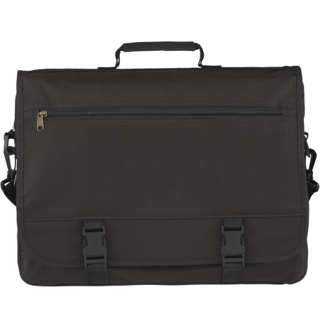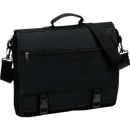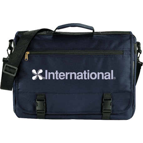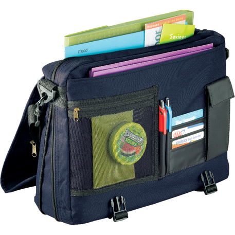 The Mariner Business Messenger Bag features an open main compartment with clipped flap closure. The expandable main compartment has a front zippered pocket and a deluxe organizer under the front flap that includes multiple pockets and pen sleeves. It also features a padded top carry handle and a detachable, adjustable shoulder strap.