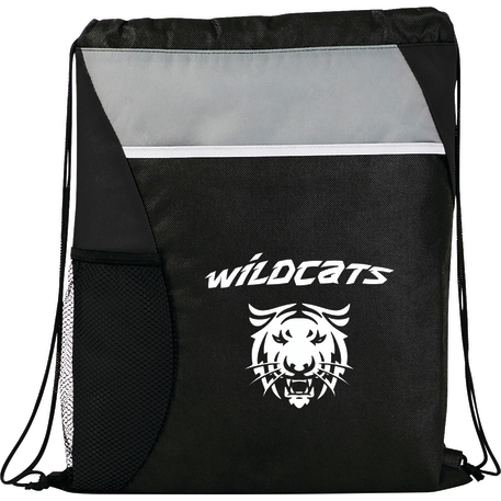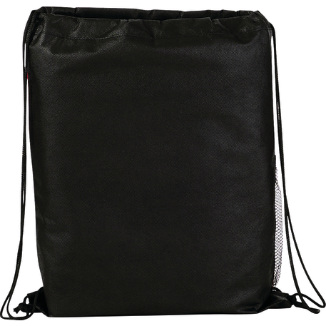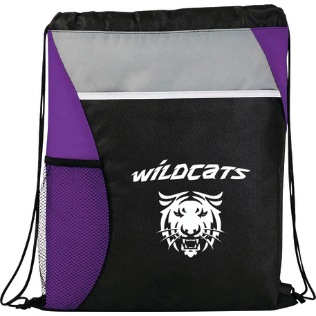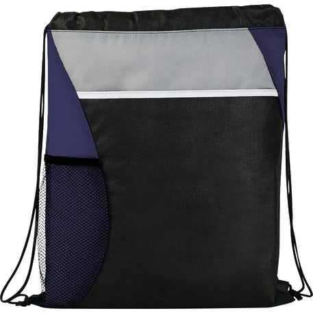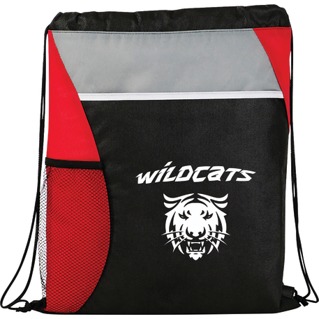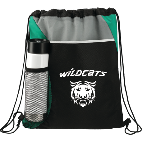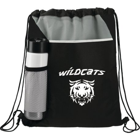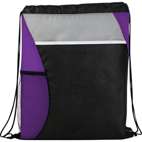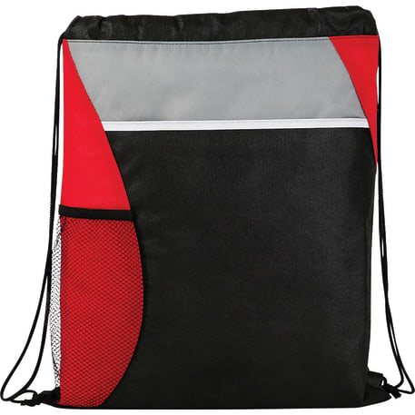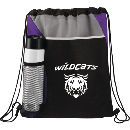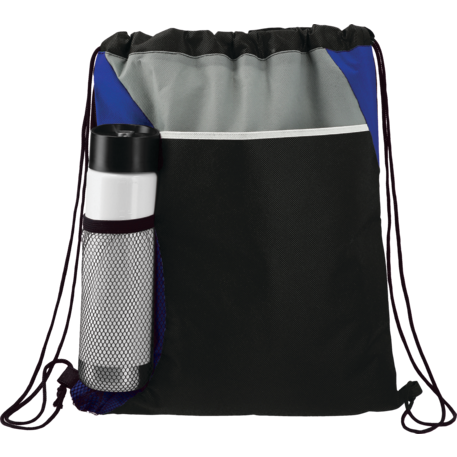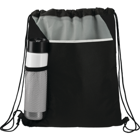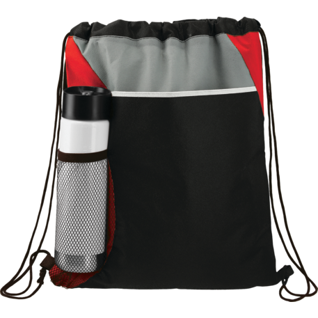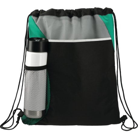 The Flare Drawstring Bag features an open compartment with cinching closure, as well as a front slash pocket and a handy mesh water bottle pocket.