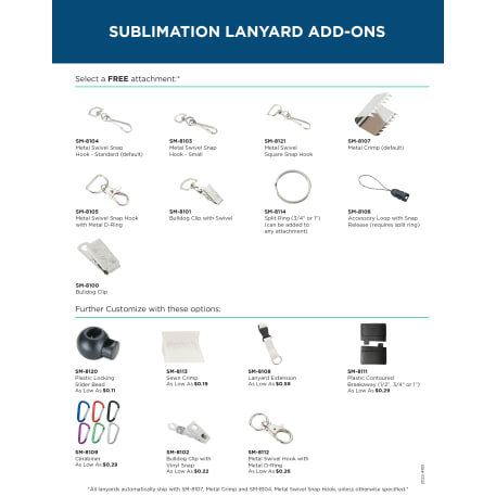 The Full Color 3/4" Lanyard with Hook is a full sublimation-dyed traditional lanyard with textured finish. Made in the USA in a 3/4-inch width, 36-inch length. Lanyard comes with a metal crimp and metal swivel snap hook (SM-8104) as default attachment. Alternate attachment options available. Must specify optional attachment item number at time of order. Packed in standard bundles of 50. FOB ZIP: RI, 02920