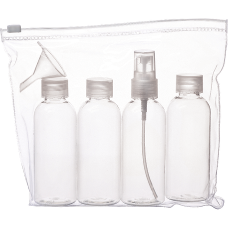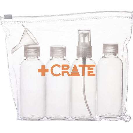 The Carry-On Kit is a zip-top resealable pouch for TSA-friendly travel. It includes three 80mL refillable bottles, one 80mL refillable spray bottle and a mini funnel. Bottles are not available for imprint.