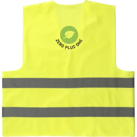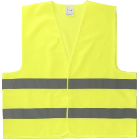 The Safety Vest is a neon yellow safety vest with reflective stripes. One size fits most up to XL. Hook and loop closure on the front.