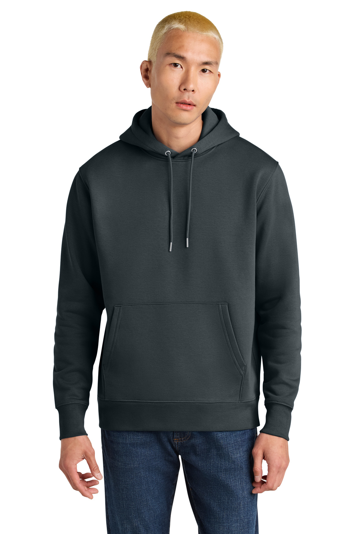 A premium hoodie with a classic look. Organic and recycled fabrics blend beautifully offering cozy warmth with refined details that stand out from the crowd. 10.3-ounce (350 GSM) 80% organic combed ring spun cotton/20% recycled polyester brushed 3-end fleece cotton face Double self-fabric lined hood Dyed-to-match round drawcords with metal tips Metal eyelets Herringbone back neck taping Self-fabric half moon at back neck 1x1 rib knit cuffs and hem Double-needle topstitch on armholes cuffs and hem seams Front pouch pocket 100% recycled polyester tear-away label Colors up to 5XL: Black French Navy Heather Grey Natural Raw Stargazer WhiteModern medium fit: Designed for a roomier fit opened up across the chest and shoulders.