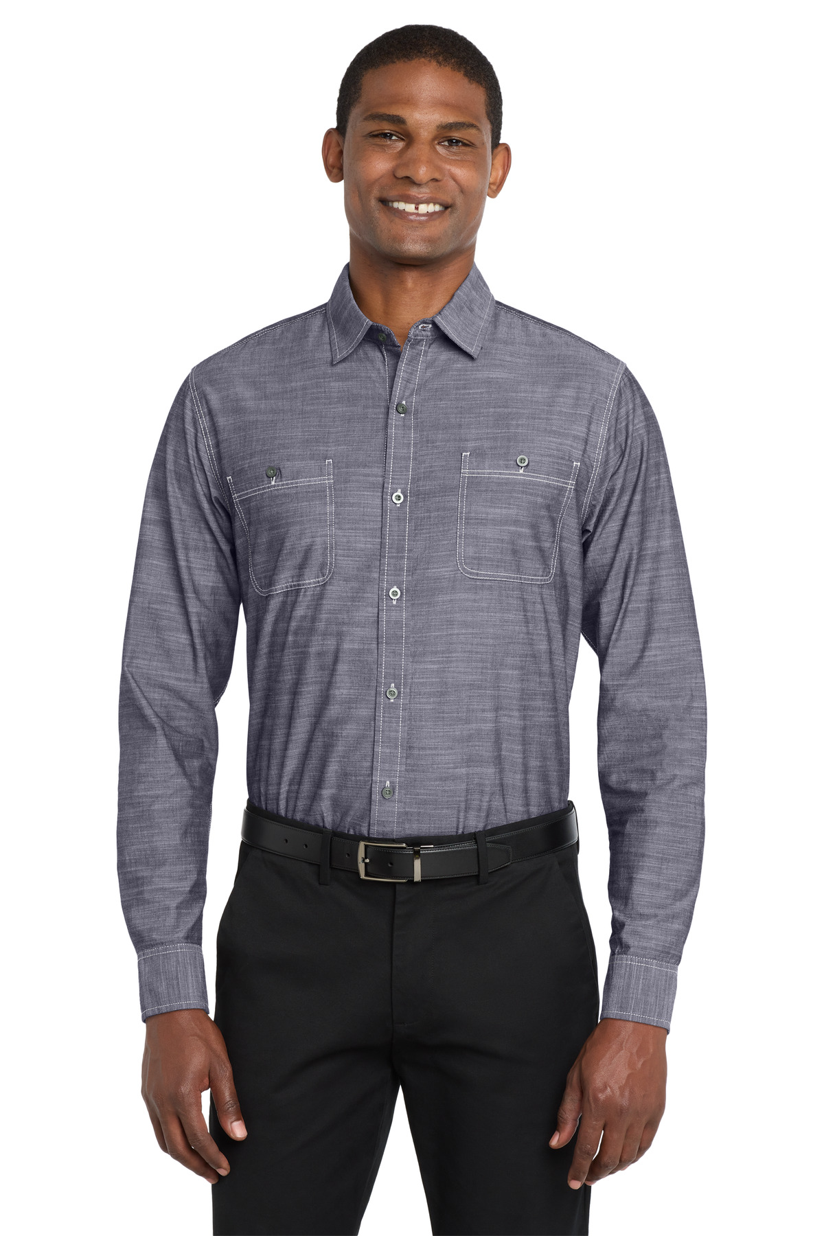 Washed chambray and off-white contrast stitching give this casual garment washed shirt an authentic laid-back look. 3-ounce 100% cotton slub chambray Open collar Back shoulder pleats Double chest pockets with buttons Rounded single-button cuffs