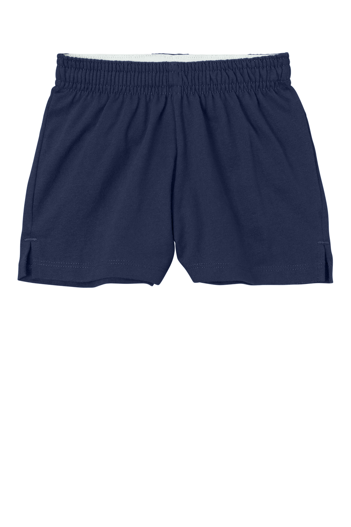 Designed for cheer dance and other activities this jersey knit short has a classic exposed waistband that can be worn rolled or unrolled. 6.2-ounce 60/40 cotton/poly White exposed inner elastic waistband 2.5-inch inseam 1-inch side vents Form fitting Tear-away label
